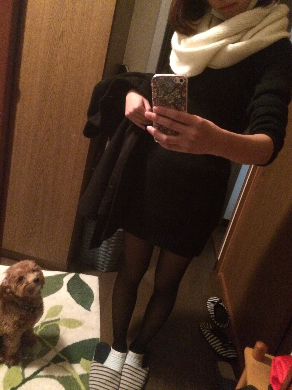 ブラック系のワンピースを着用したレディースの秋コーディネートの1枚目の写真