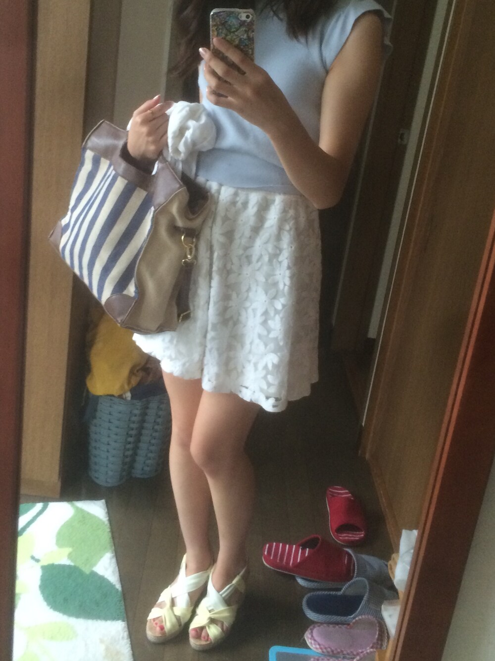 ホワイト系のスカート、ブルー系のワンピースを着用したレディースの夏コーディネートの1枚目の写真