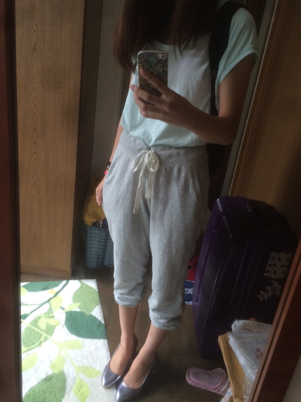 グレー系のその他パンツ、ブルー系のTシャツ/カットソー、シルバー系のパンプスを着用したレディースの夏コーディネートの1枚目の写真
