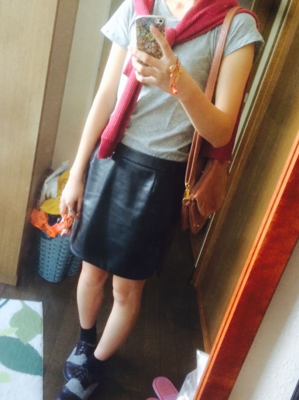 ブラック系のスカート、グレー系のTシャツ/カットソー、レッド系のニット/セーターを着用したレディースの秋コーディネートの1枚目の写真
