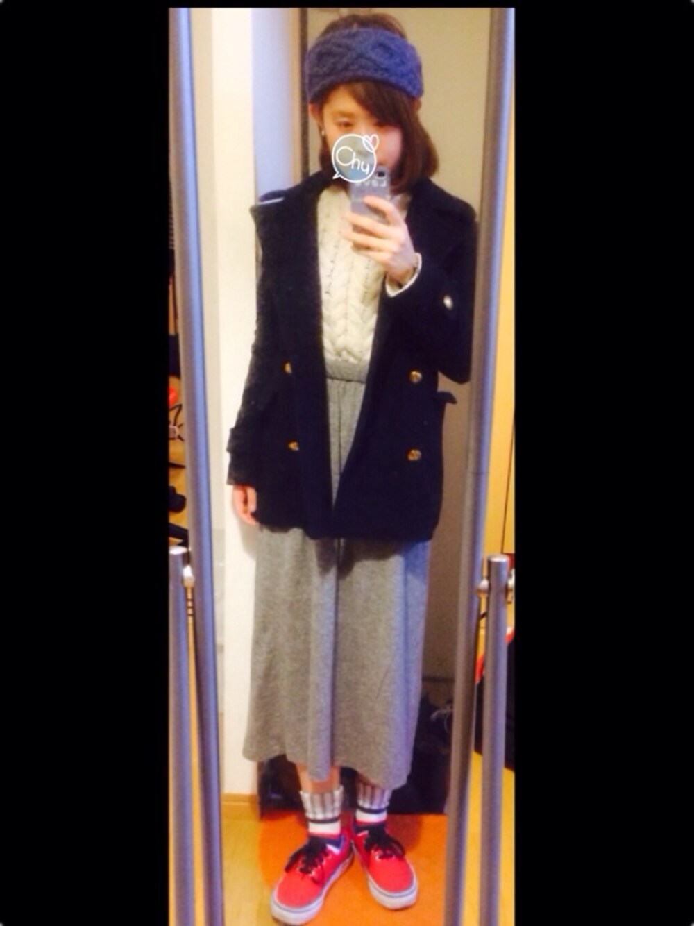 赤が好きです コート:SHIPS ニット:H&M スカート:UNIQLO スニーカー:VANS ヘアバンド:Dieu