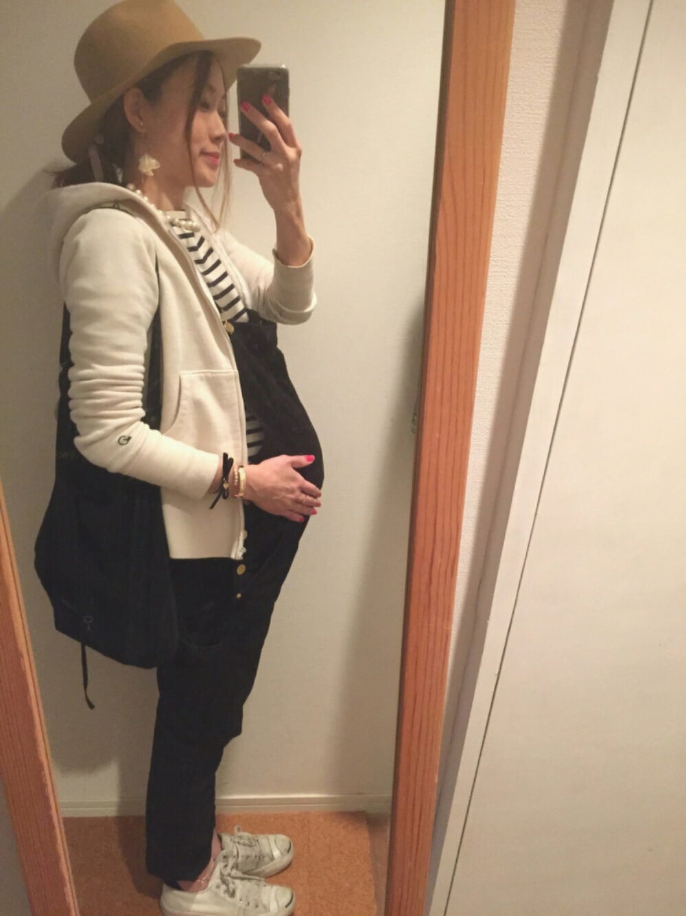 妊娠9か月目のマタニティコーディネートに自身のブランドwarmthのアクセサリーを合わせました♡♡ 入る服がほとんどなくなりましたが、こちらのオーバーオールはマタニティウェアではありません⭐️✨ 少し下め?下し気味?で着るとまだまだ着れそうなので産後も着れるしマタニティの方にはおすすめです♪(´ε` ) 似たようなコーディネートになってしまいましたが😭💦 自撮りに慣れず、疲れました😭 エコバッグはEditionのショッパーです♥︎ 愛用してます♪ 赤ちゃん出てくるの楽しみです♪(´ε` )