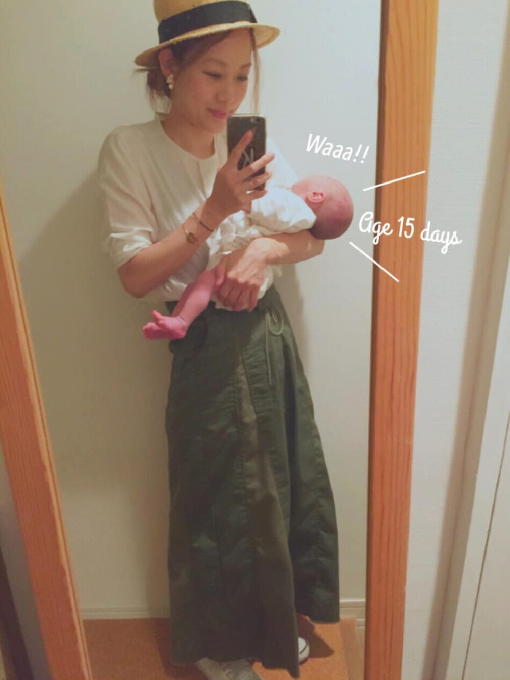生後15日目♡♡♡ 今日は産婦人科に母乳外来へ行ってきました♪(´ε` ) 2人でのお出かけにドキドキー♡ 今まで入らなかったお気に入りのスカートに自身のブランドpetit BY warmthのサンプル商品をつけて♡♡ このバングルはあと2ヶ月くらいで入荷するかなぁ〜♪(´ε` )楽しみ〜♡♡ とっても可愛いのでぜひ♡♡♡