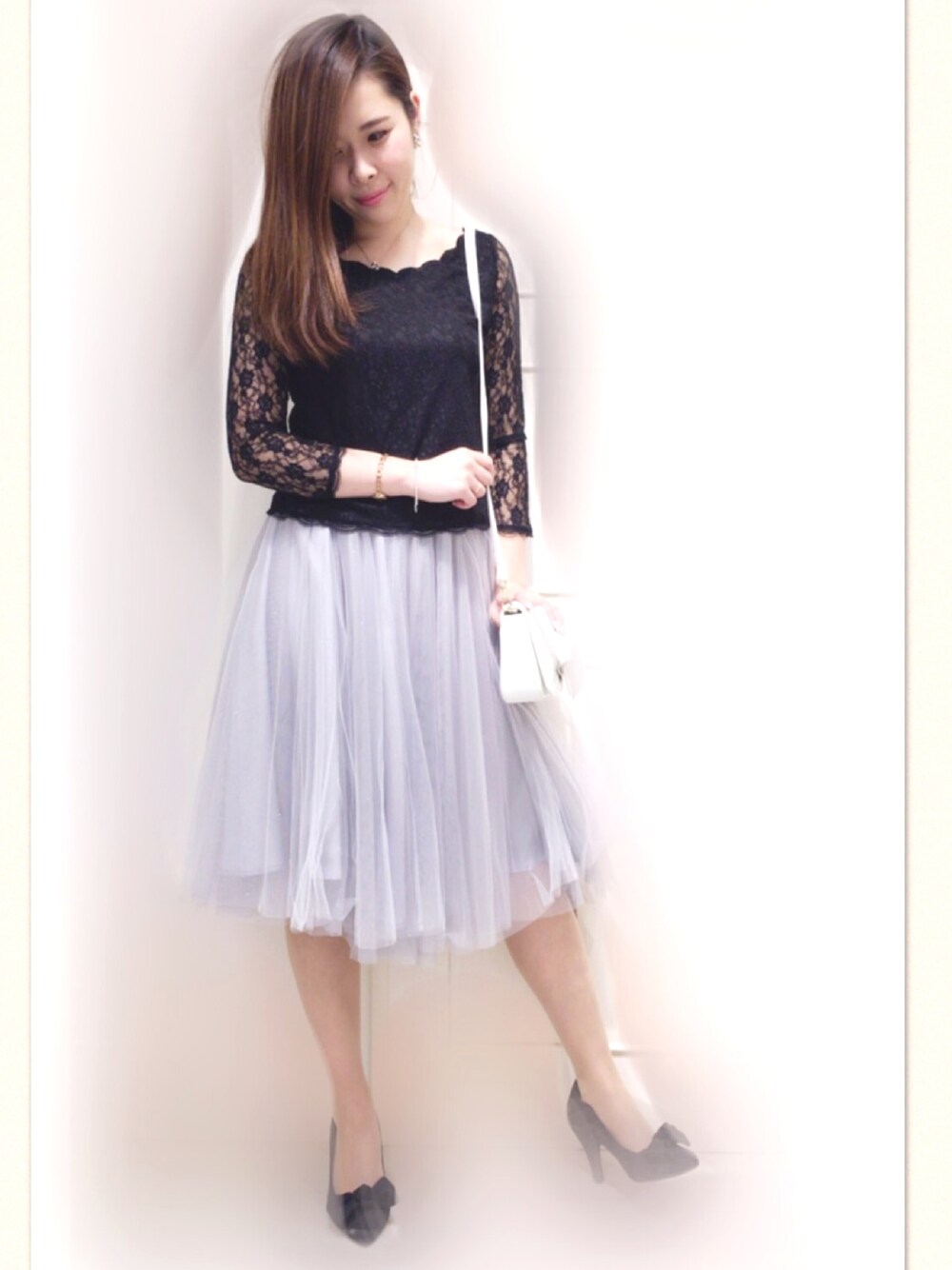 こんにちは☺︎✨ いいね SAVEありがとうございます💓💓 チュールスカートで甘すぎないように 黒のレースのトップスで合わせました💓 チュールスカート やっぱり可愛い😍♡