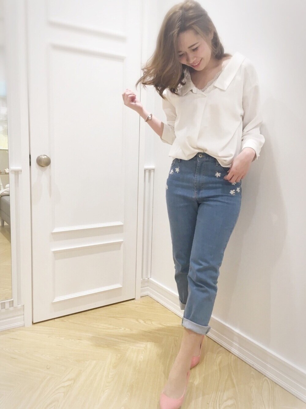 こんばんは♡ いいね SAVE ありがとうございます☺️💓 抜け感があるブラウスに デニムコーデ♡ デニムの刺繍が本当に可愛くて お気に入り😙💓