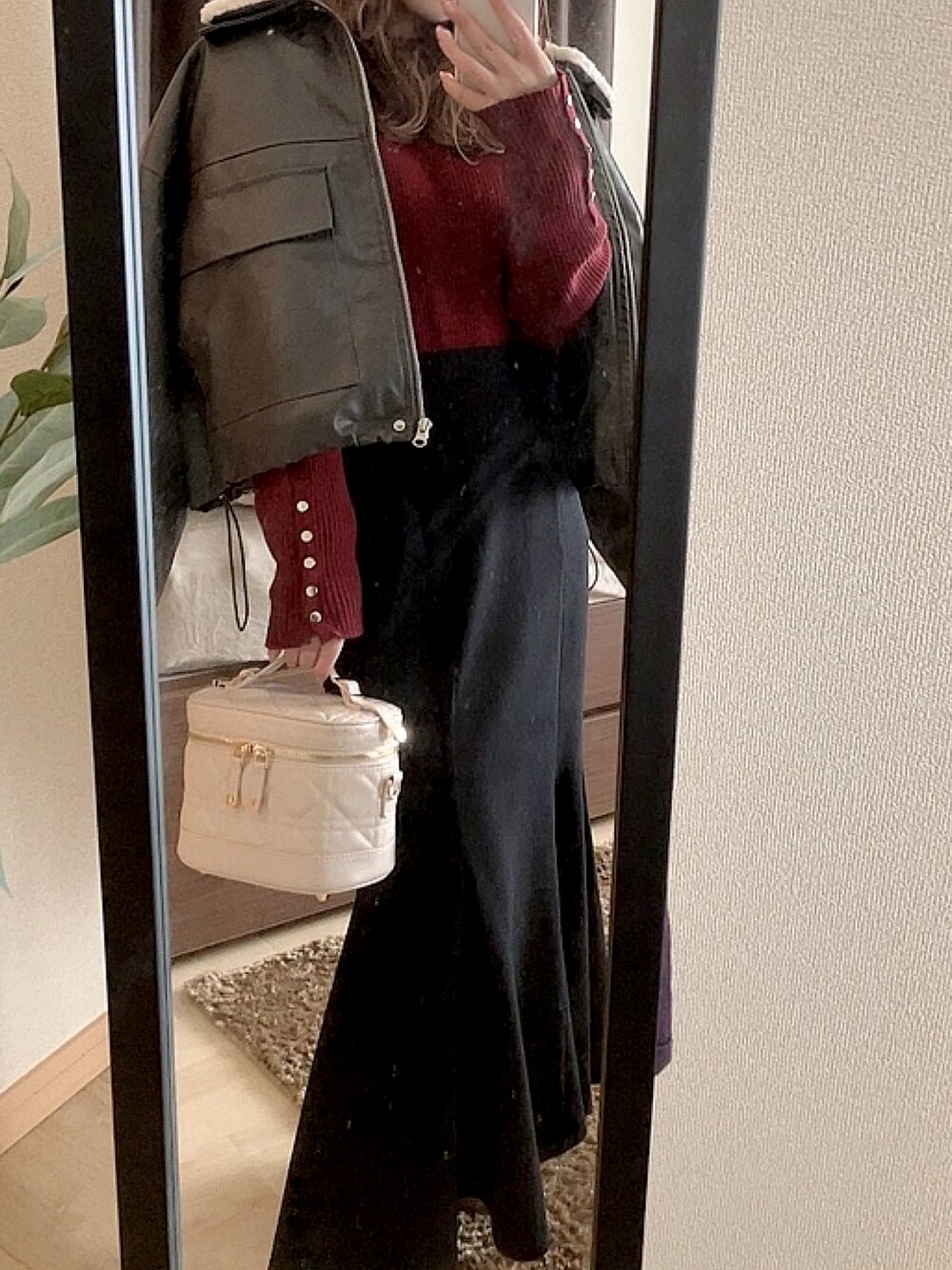 <商品番号> アウター:【kd90 グレー サイズF】 トップス:【袖口ボタンボトルネックリブニットプルオーバー】 スカート:【不明 ブラック サイズS】 シューズ:【スクエアトゥフェイクレザーショートブーツ ブラック サイズ37】 バッグ:【3WAY バニティバッグ キルティング ショルダーバッグ エレブ アイボリー】