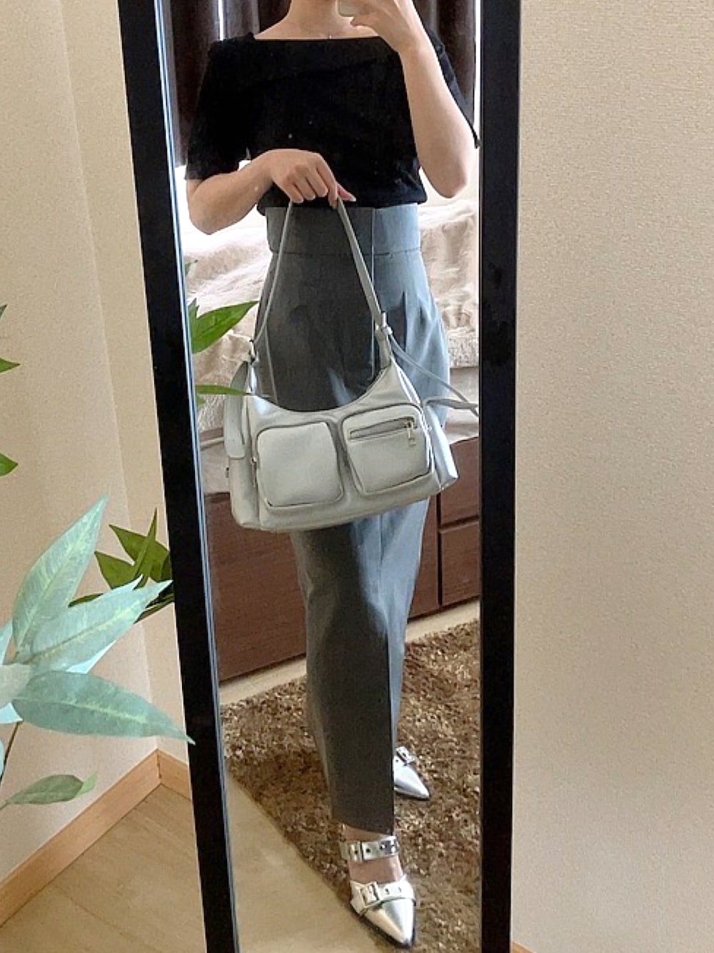 <商品番号> トップス:【tu1653 ブラック サイズM】 スカート:【ai69 グレー サイズS】 シューズ:【zr1274 シルバー サイズ22.5cm】 バッグ:【tr836 シルバー】