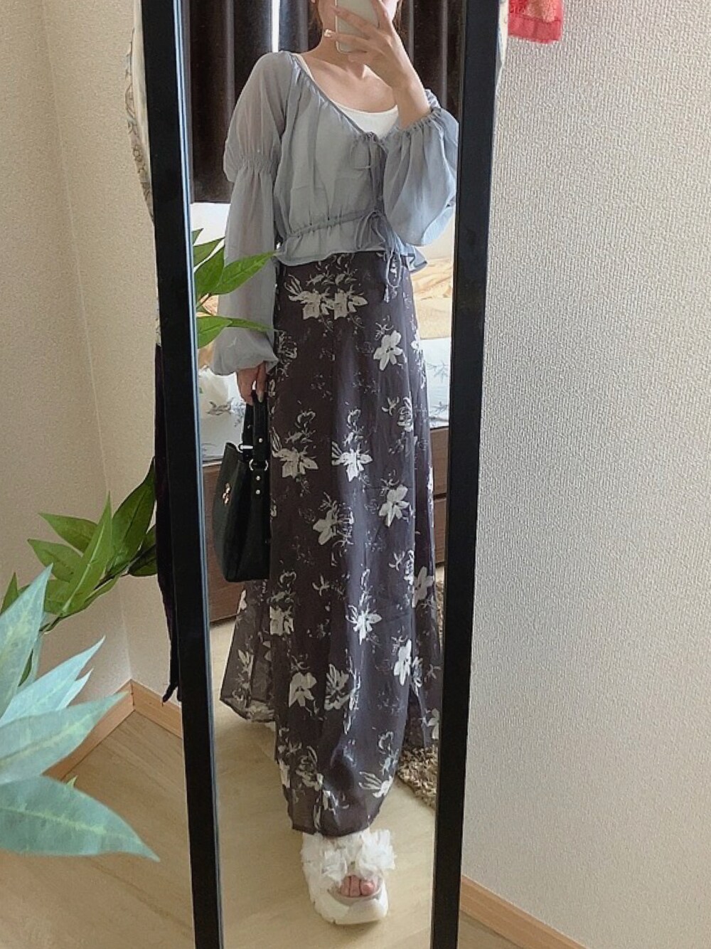 <商品番号> インナー:【dk908 オフホワイト サイズS】 ボレロ:【dk1191 ブルーグレー サイズF】 スカート:【ta264 チャコール サイズS】 シューズ:【zr1214 アイボリー サイズ22.5cm】 バッグ:【tr544 ブラック】