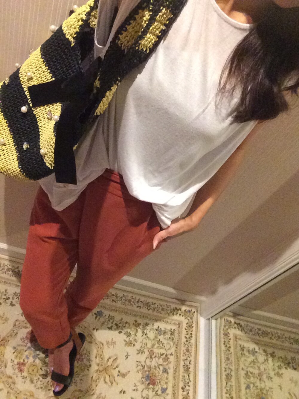 ラフなシルエットで秋っぽさを感じさせる晩夏スタイル^ ^ オレンジ系ブラウンボトムスがアクセント