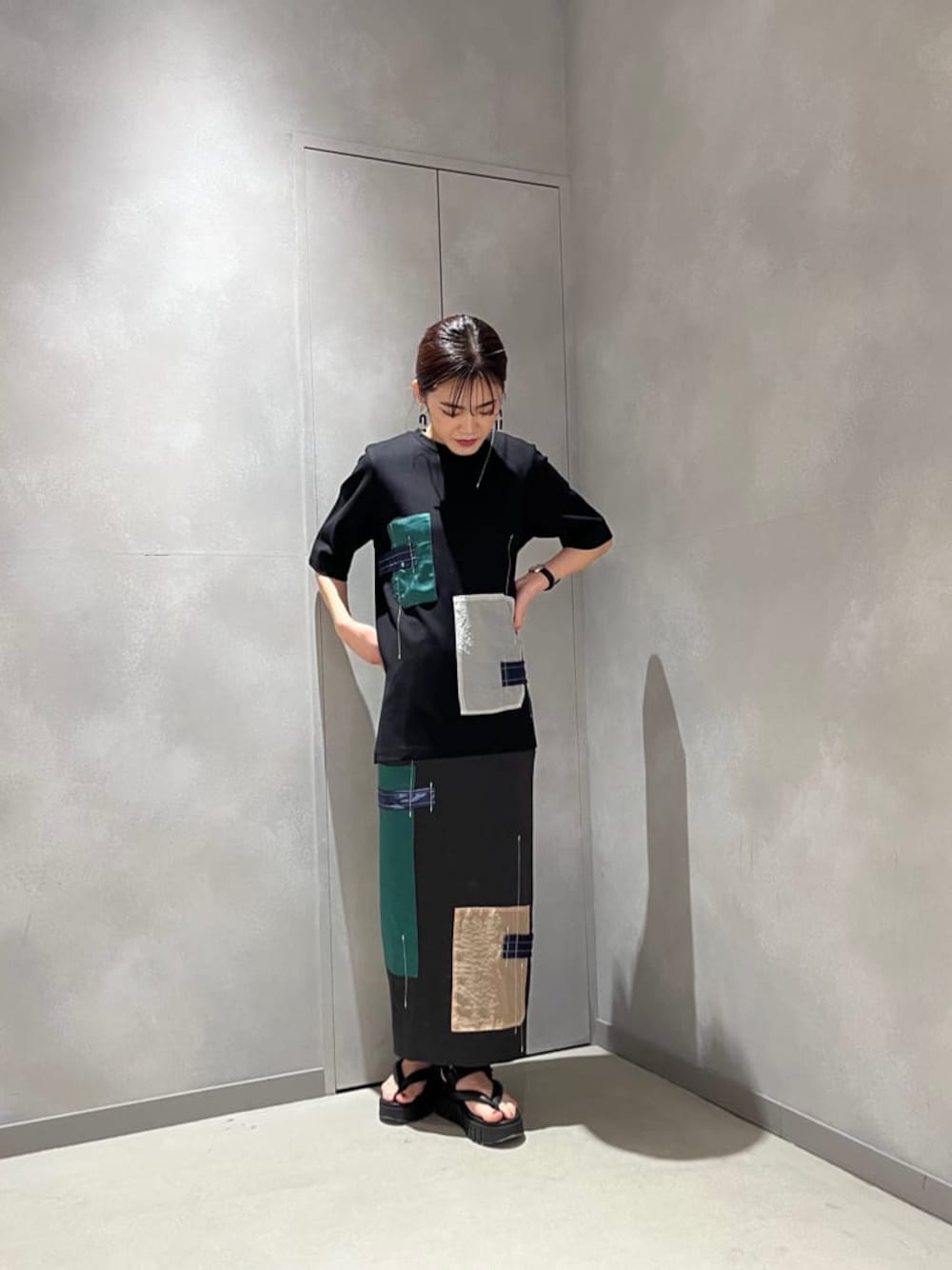 【PATCHWORK T-SH】パッチワークとステッチがポイントのトップス。ふっくらとした肌触りの良い素材で着心地が良く、ルーズ過ぎないシルエットです。デザイン性があるので1枚で様になるアイテム。【PATCHWORK SK】トップスと同じシリーズのスカート。サテン素材でサラッとした着心地。Iラインシルエットなので、スッキリした印象で着て頂けます。