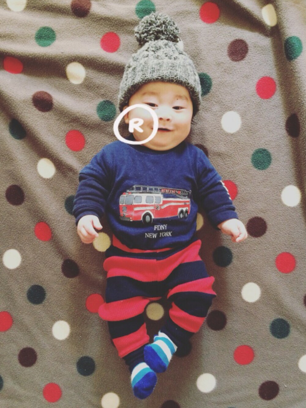 紺×赤コーデ お得意の二重あご‼︎‼︎ おととい5ヶ月になりました(^^) 離乳食は来月から始めよう。。 ゆっくりと!