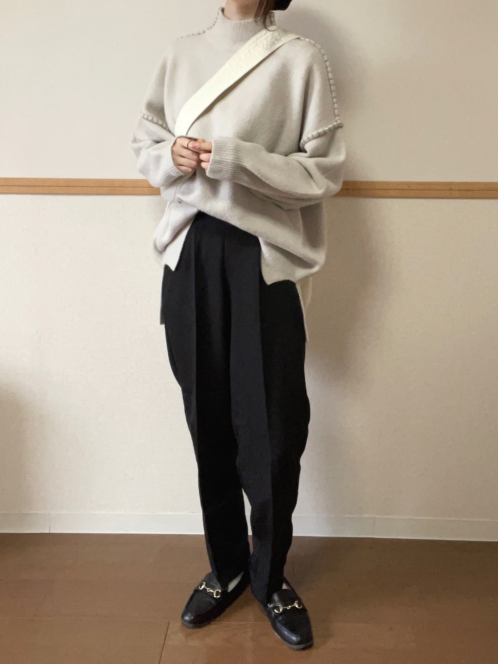 Rin*のニット/セーター「ざっくり可愛い。モックネックハンドステッチ風オーバーサイズニット」を使ったコーディネート