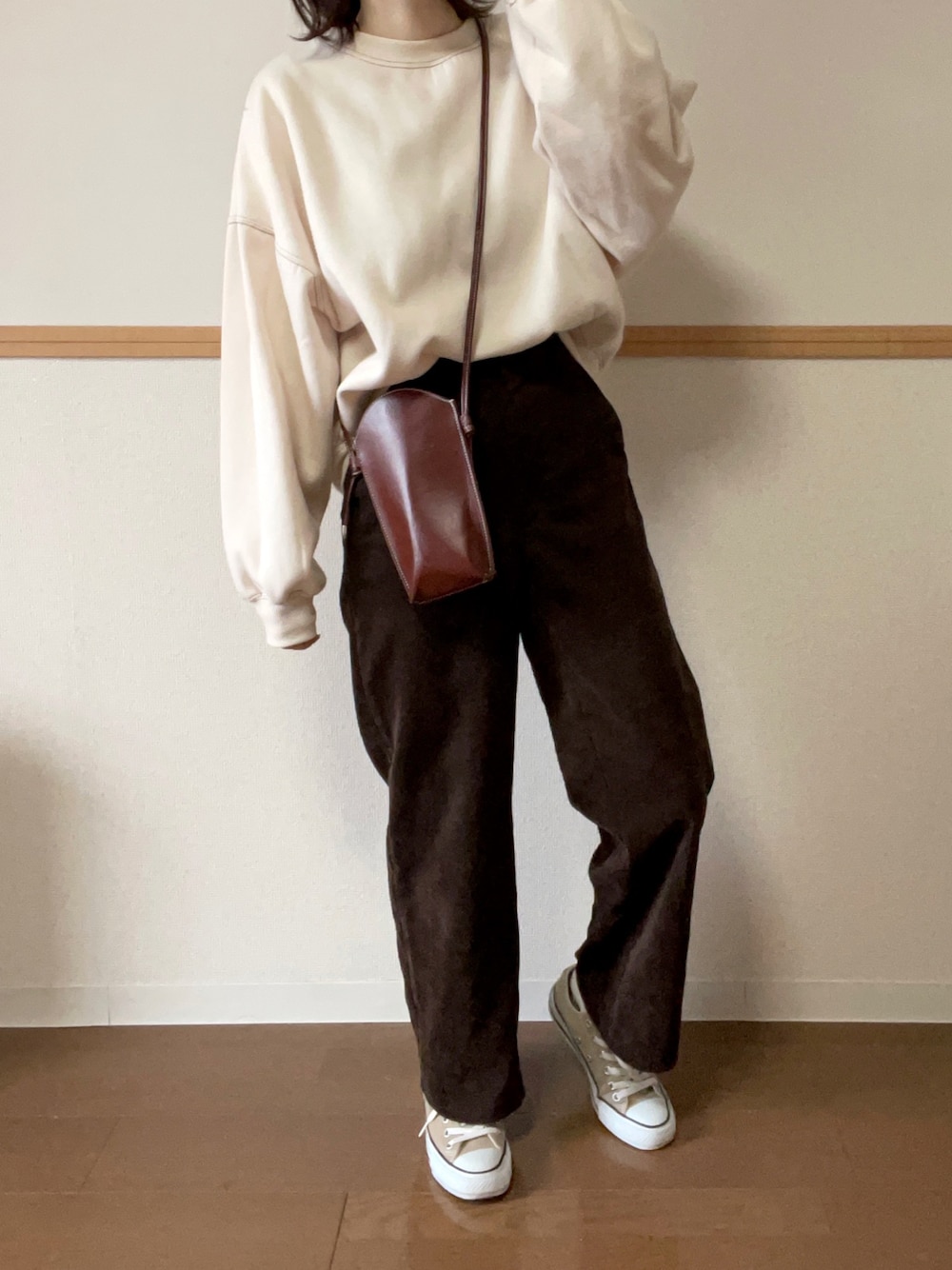 ホワイト×ブラウンコーデ🧸 ゆるく過ごしたいときは 大体この組み合わせ🥺 ズボンは去年購入したGUの コーデュロイパンツです🤎 ----- 🏷classicalelf 🏷GU 🏷CONVERSE 🏷NEUNA 見ていただきありがとうございます🙏🏻✨