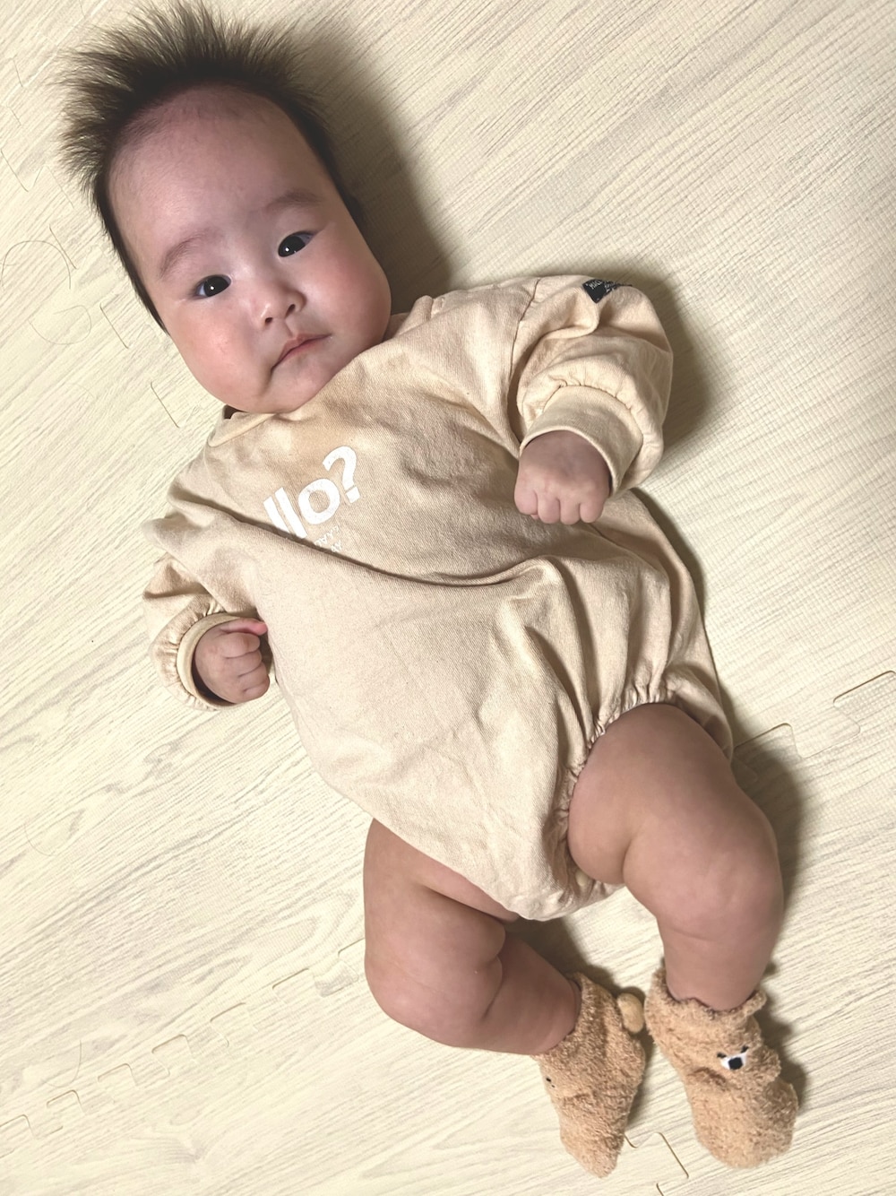 よだれがついちゃったけど可愛い🥳 最近急に寒いから長袖ロンパース(^^) 靴下はアプレレクールでアニマルソックスてやつ 可愛い😇