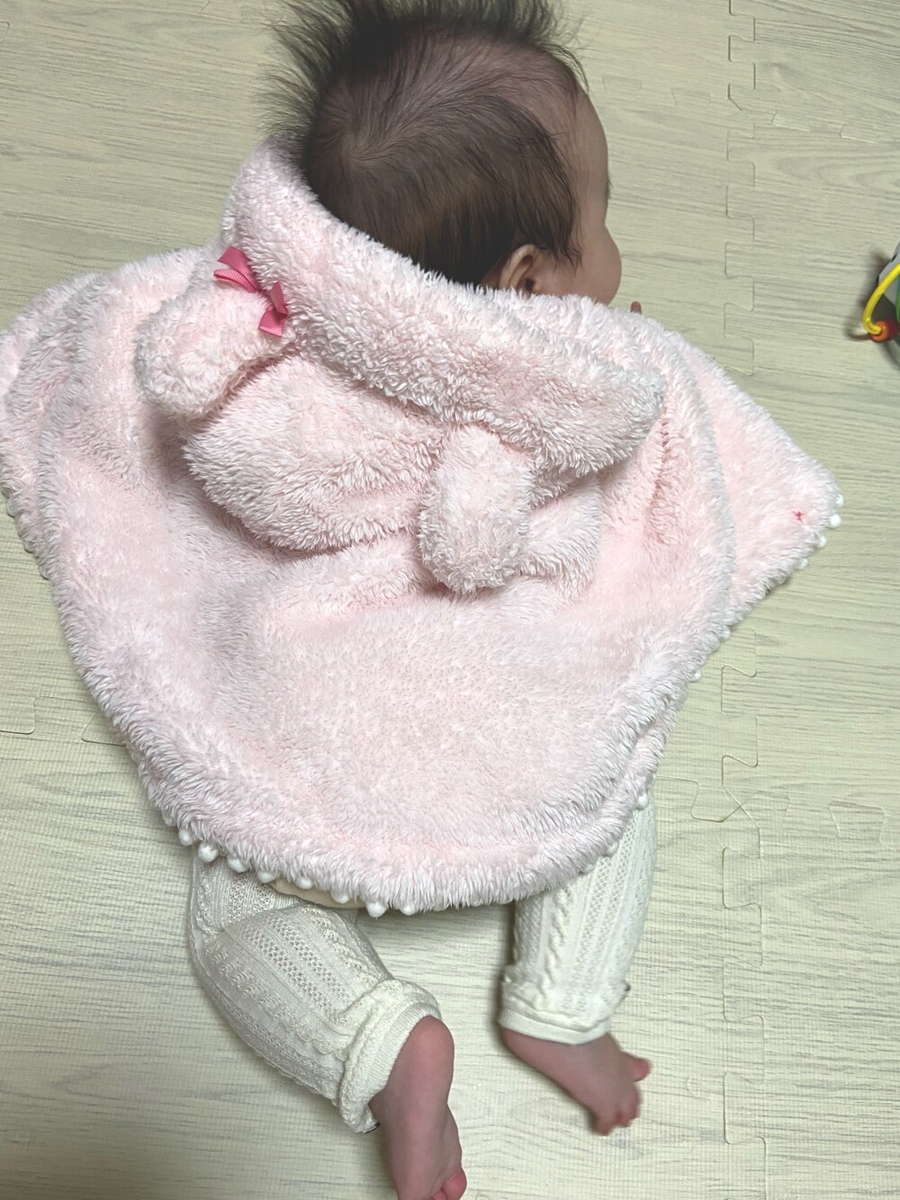 くま耳?うさ耳ポンチョに レッグウォーマーはかせた😇 めっちゃ可愛い🥰 暴れるから正面からは撮れなかったけど 今度また挑戦してみよう🤣笑