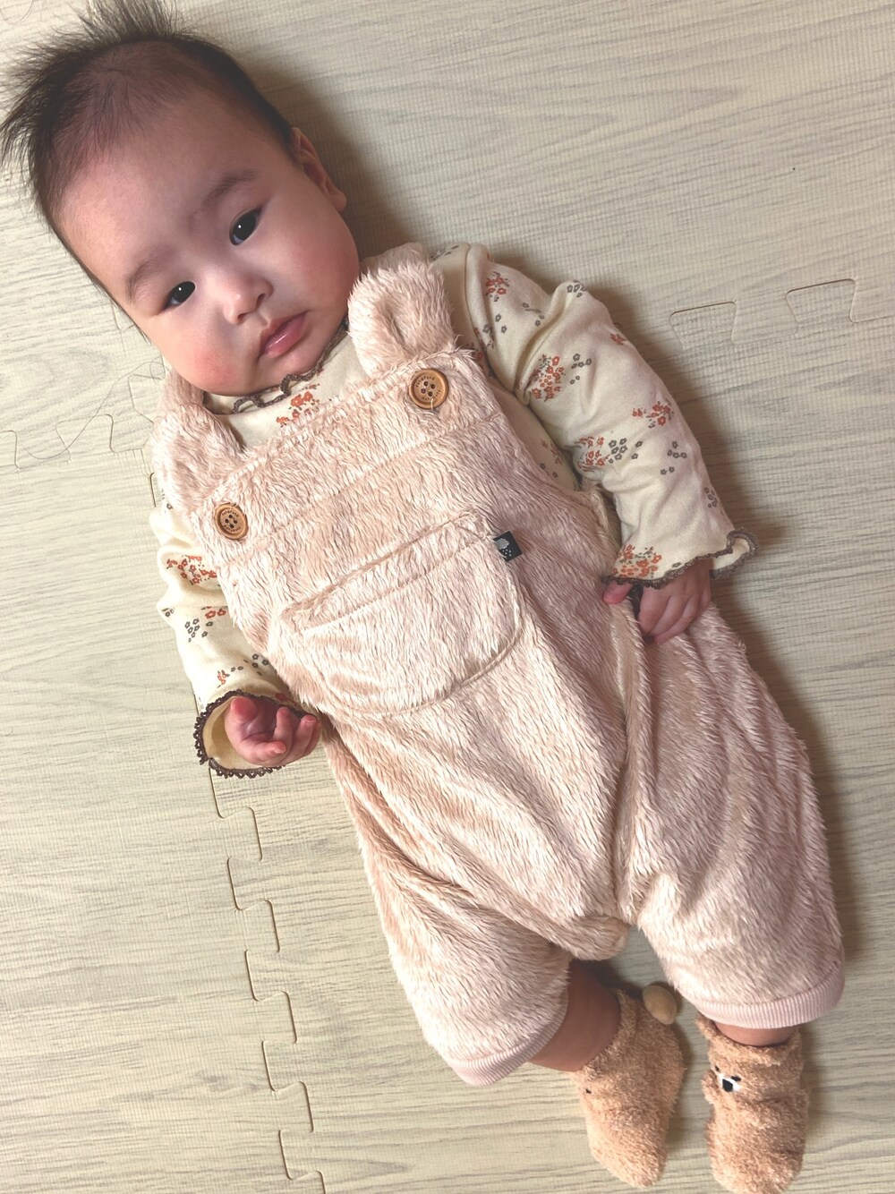今日は寒くておNEWのサロペット着せたよ👼🏼 よくみるとクマ耳ついてて肌触りも良くて可愛い🧸💕 股はパッチンだからいちいち脱がせなくてもいいから便利🥰 バースデイで購入したのでプチプラ~😍