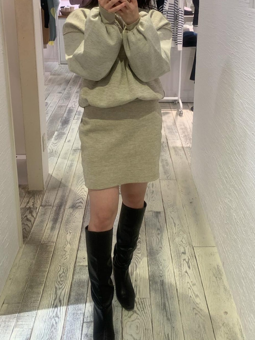 ミニ丈セットアップとロングブーツの合わせかわいい~🤍 GRLのブーツはプチプラやのに優秀!!