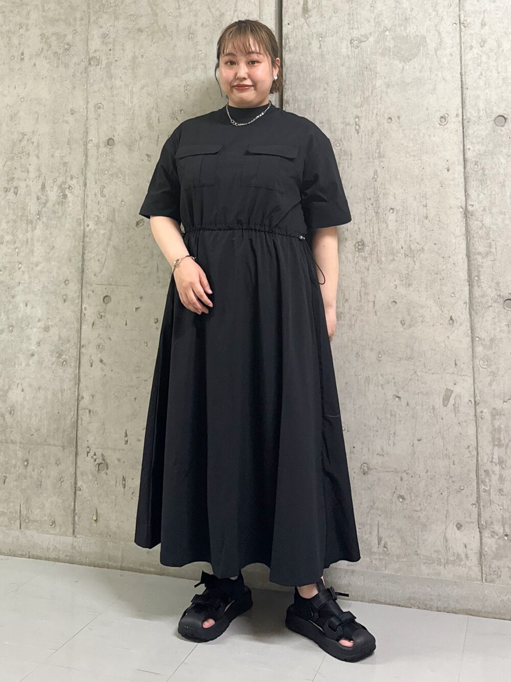 一枚でコーデが決まるワンピースのご紹介です! ウエストはドローコードで調整が出来て、サイズもゆったりとしていて着やすいです! お袖も長めなので二の腕カバーも出来て◎ サンダルはゆとりのあるサイズ感で楽に履けて歩きやすいです!