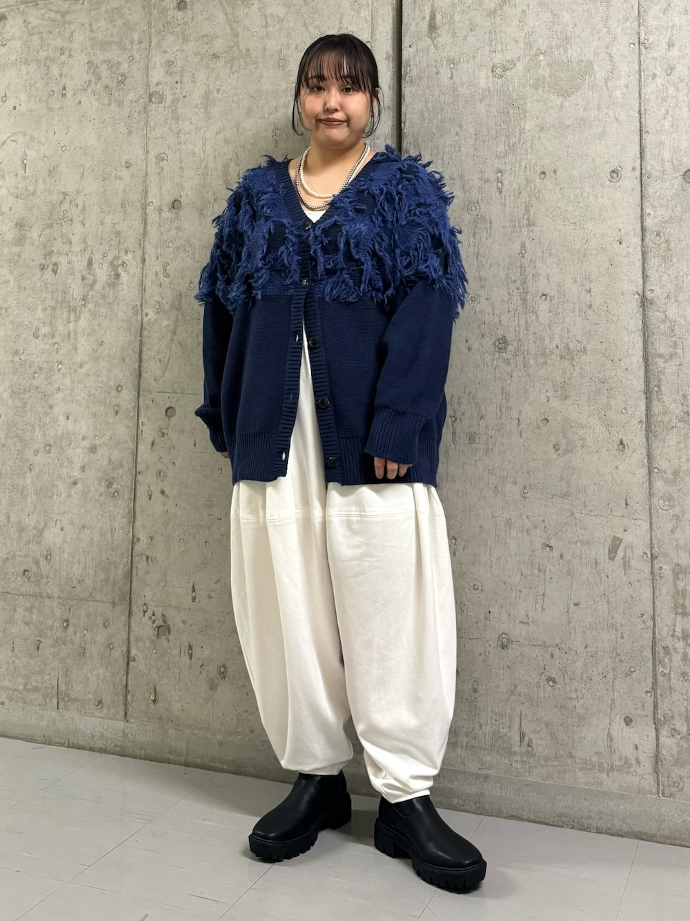 ニットカーディガンはお尻が隠れる長めの丈感で、とても暖かいです! ゆるっと羽織れて中も着込めて◎ パンツはウエストがゴム仕様でストレスフリーで穿けて◎
