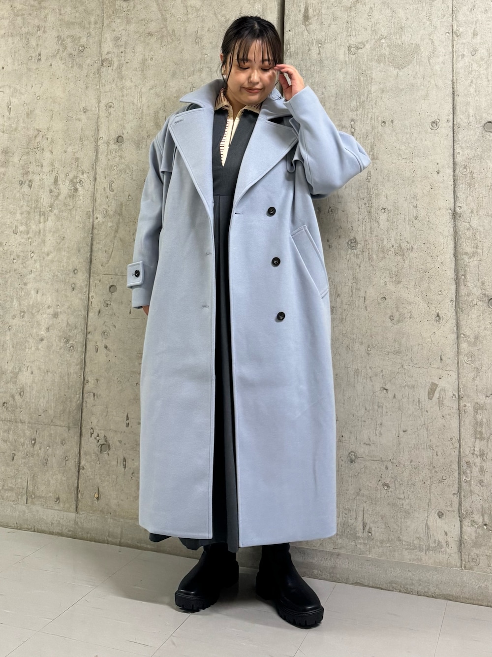 コートはオーバーサイズでゆるっと羽織れて、高身長の方も着やすいロング丈になっています! ライトブルーのお色味は珍しく綺麗めシーンにも使えて◎ ワンピースはインナー次第でロングシーズンお使いいただけます