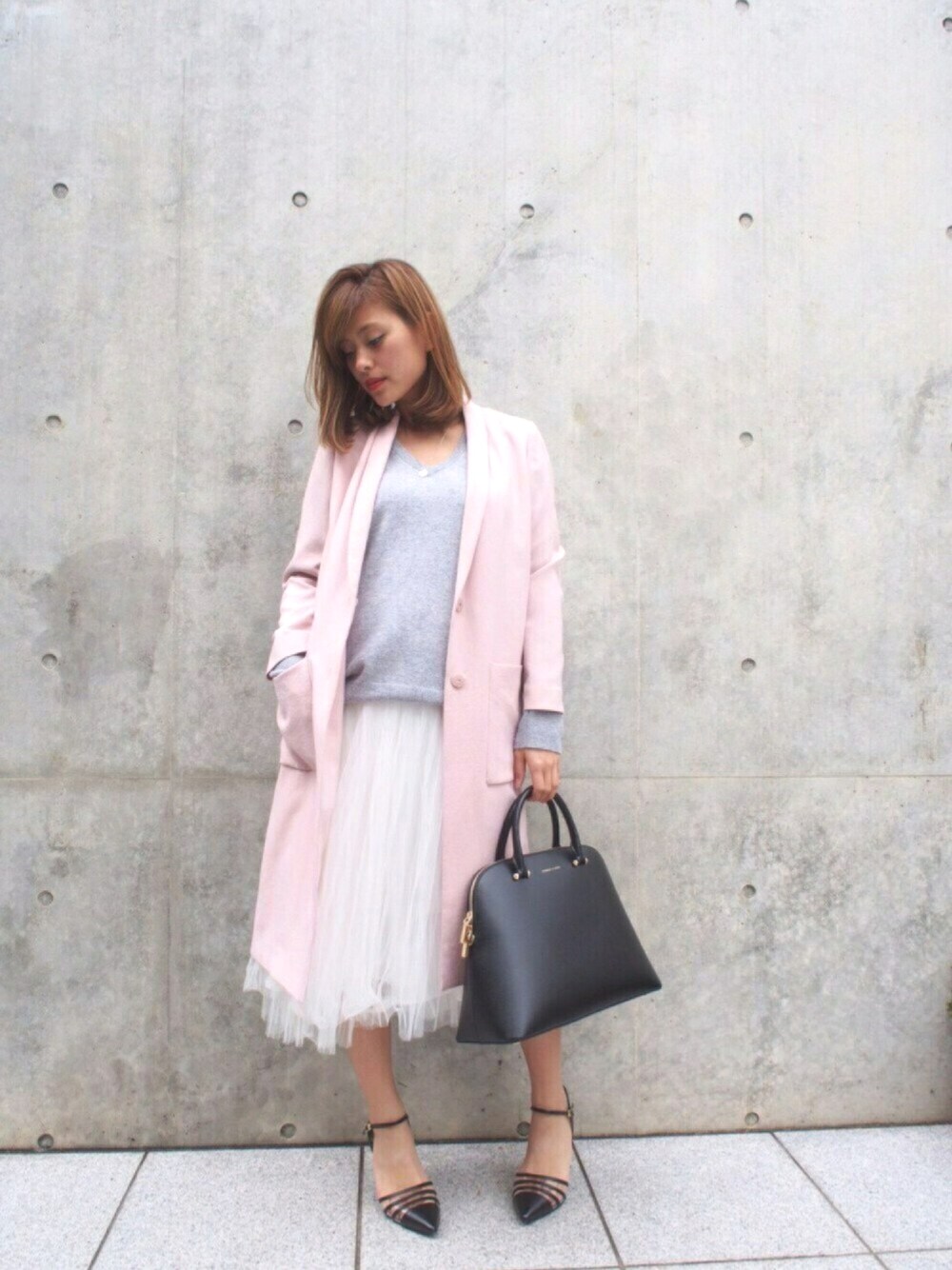 淡いカラーのロングジャケットとbeauty&youthのカシミアニット、プリーツチュールスカートで春を意識したコーディネート…* クリアー素材がコンビネーションになった女らしいパンプスがポイント。 娘のオムツや自身のメイク道具、財布や小物なども入るバッグがお気に入り。 ママでもきちんとしたスタイルになれるバッグ❤︎