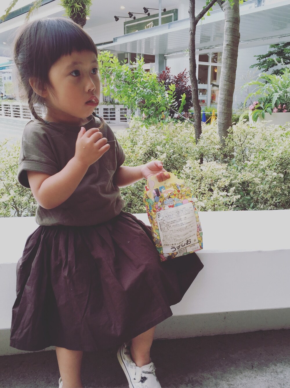 ポップコーンもぐもぐ✨ このワンピ、上下でテレコ素材でかなり可愛い💕