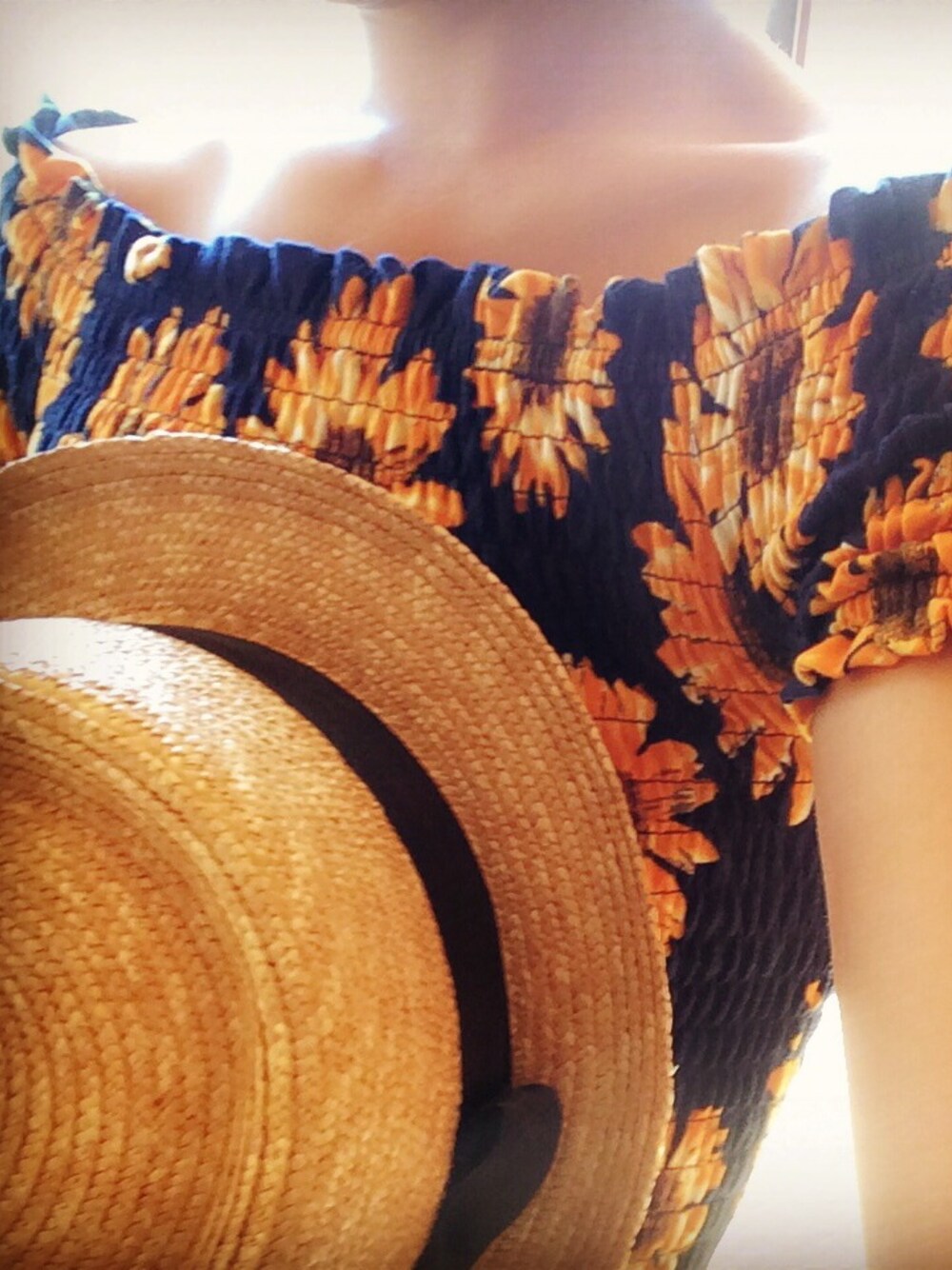 オレンジ系のその他トップス、ベージュ系のハットを着用したレディースの春コーディネートの1枚目の写真
