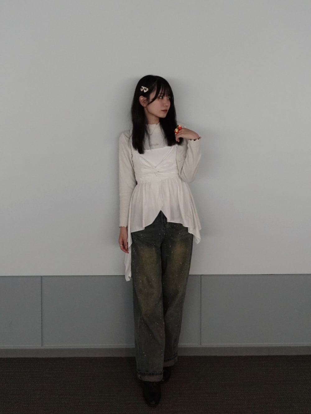 rinのデニムパンツ「【SNSで話題のキラキラデニム!】オーロララインストーン付きヴィンテージルーズデニムパンツ」を使ったコーディネート