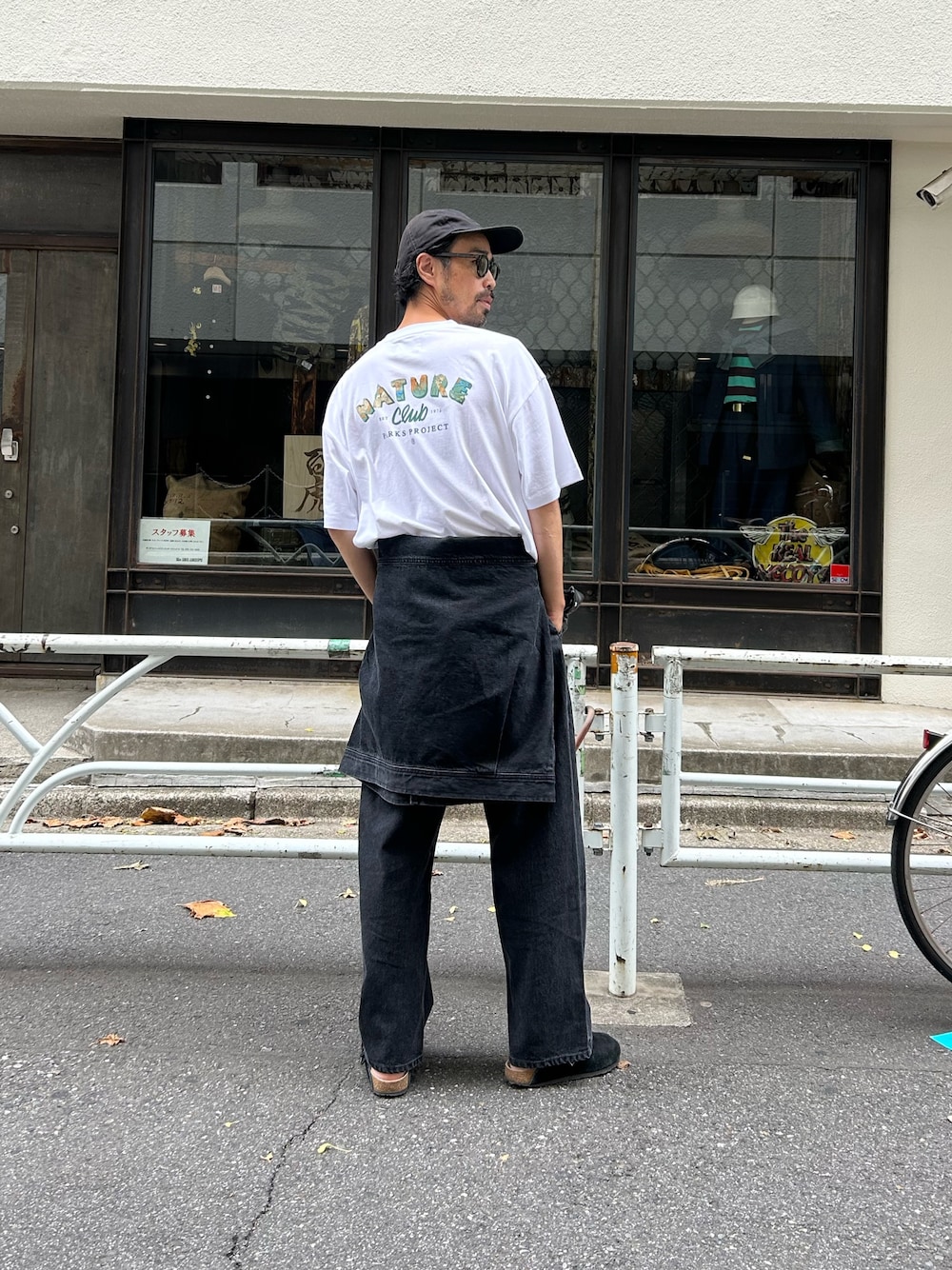 バックプリントが際立つTシャツを使ったデニムコーデです デニムジャケットを腰巻きしてアレンジしました