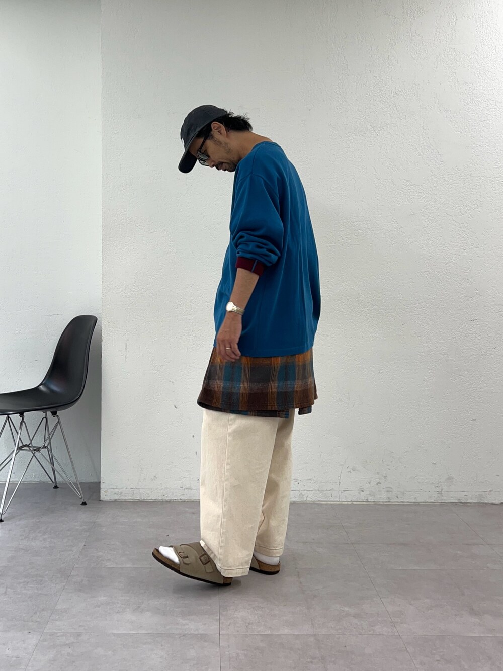 シンプルなスタイルに秋色のチェックを腰巻きするだけで初秋の小慣れたスタイリングになります🎵