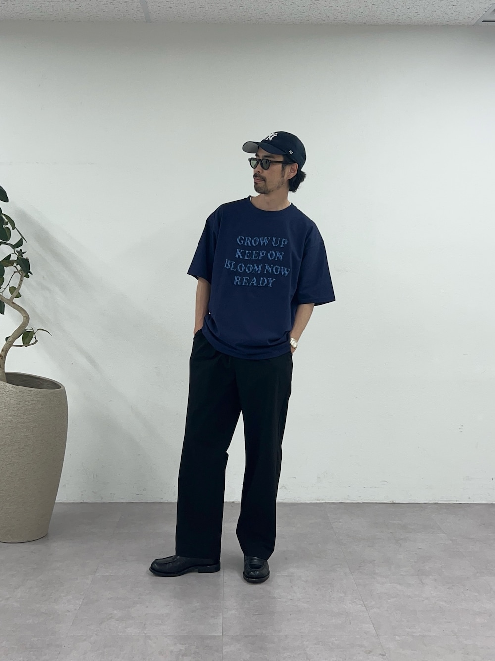 スッキリとしたカラー合わせの大人なコーデにアップリケの遊び心のあるTシャツを使いました🎵ハードすぎない大人カジュアルに仕上がるTシャツがポイントのコーデです