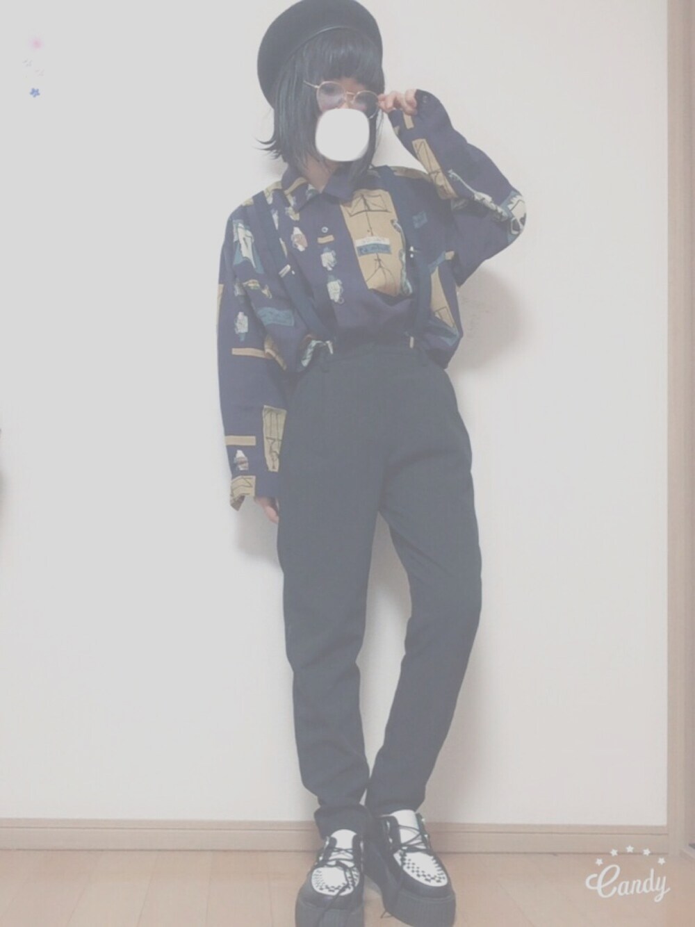 古着のシャツがポイントです。あとはお気に入りのサングラスとまたまたベレー帽を使いました。靴は厚底でなるべく足を細く見えるようにしました。
