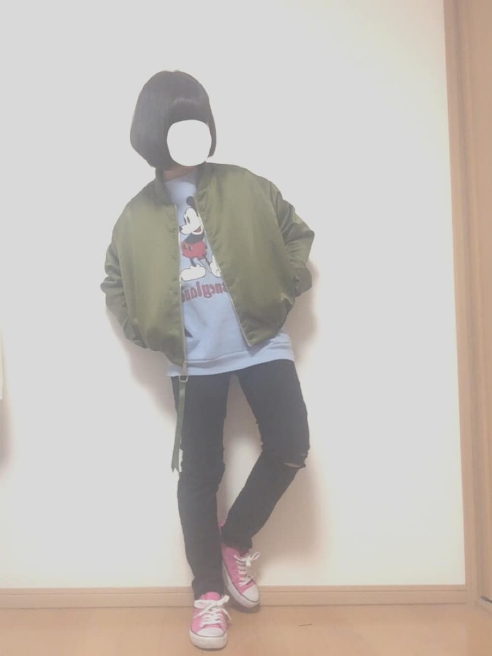 美容院に行ってきました💇💕 今回はANAPのMA-1が丈が短めでチャックのところの紐が長めでとっても気に入っています!チャック閉じても可愛いです(*_*)可愛さも入れたくてミッキーのスウェットを中に着ました!