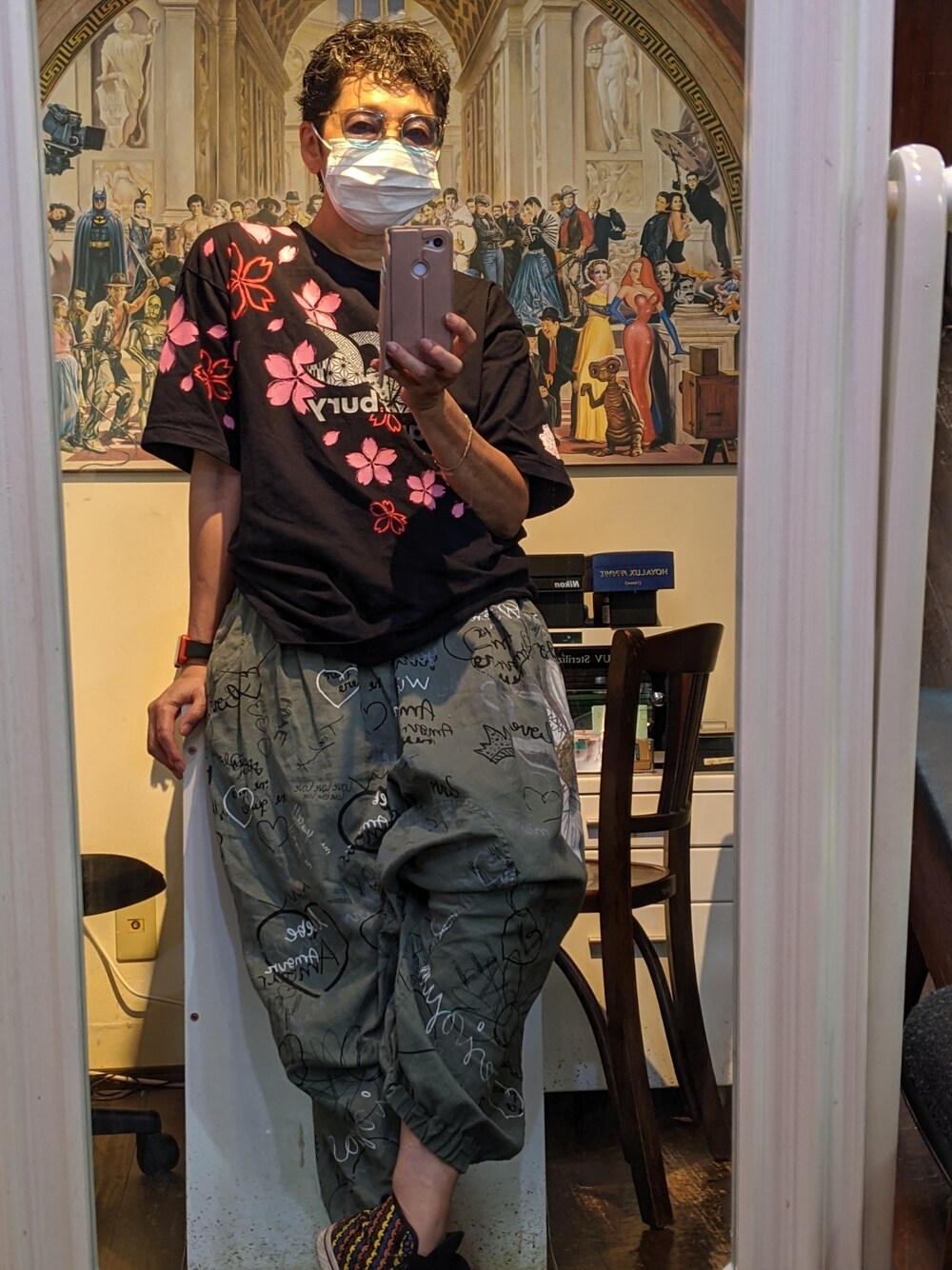 このファッションに合うサングラスを探したら、やはりFACTORY900に行き付ききました。ブルーグラデーションの派手なやつだけど、かけてみると悪目立ちせず、落ち着く感じですね。