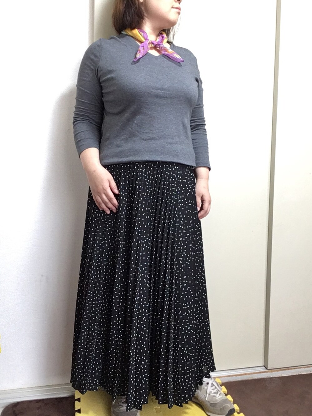 今日は仕事が休みなので、休日コーデです😊 今季流行のスカーフを巻いてみました🧣 スカーフなんて何年ぶりだろう…。 シンプルなコーデに映えますね☆