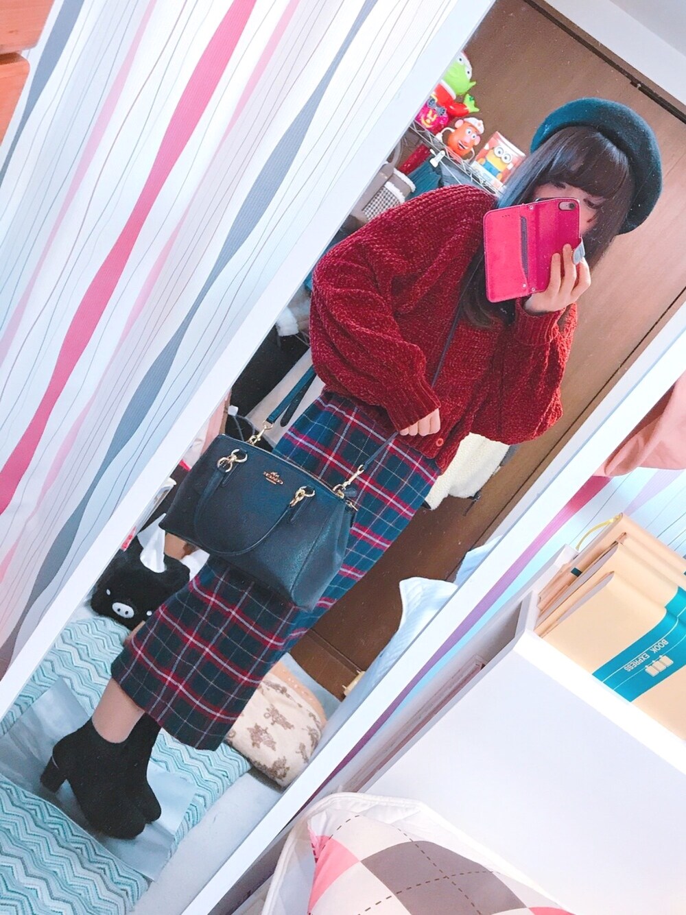 ネイビー × レッド GUのチェックスカートがかわいい *