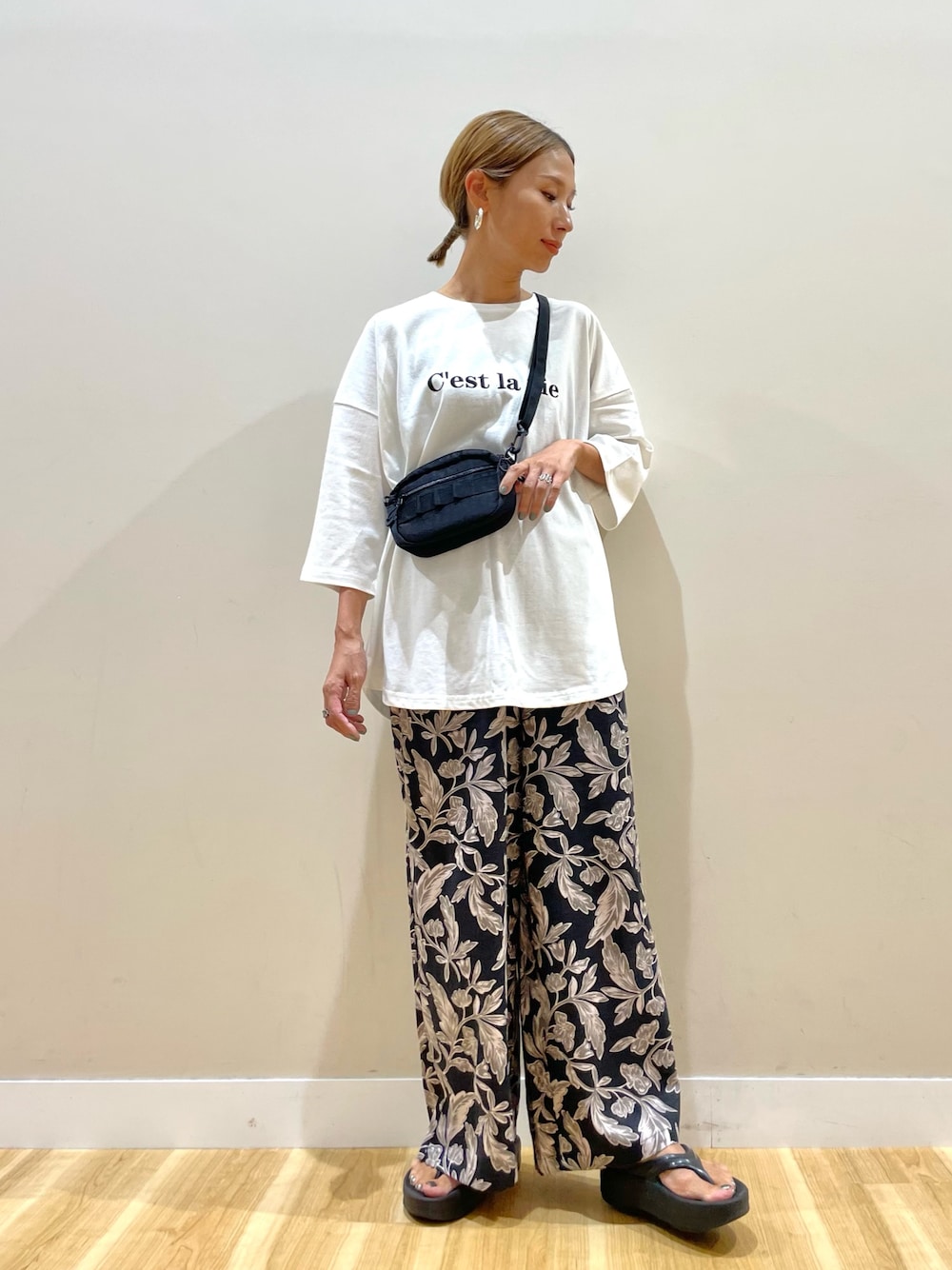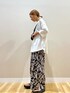 ご覧頂きありがとうございます🥰 今から活躍間違いなしの5部袖のTシャツは シンプルで大人っぽいロゴが使いやすく、 Aラインで長めの丈感はお尻まで隠してくれるので リラックスしてご着用頂けます🫶🏻 柄が印象的なパンツはナチュラルな素材感で ゆったりと履きやすいです!