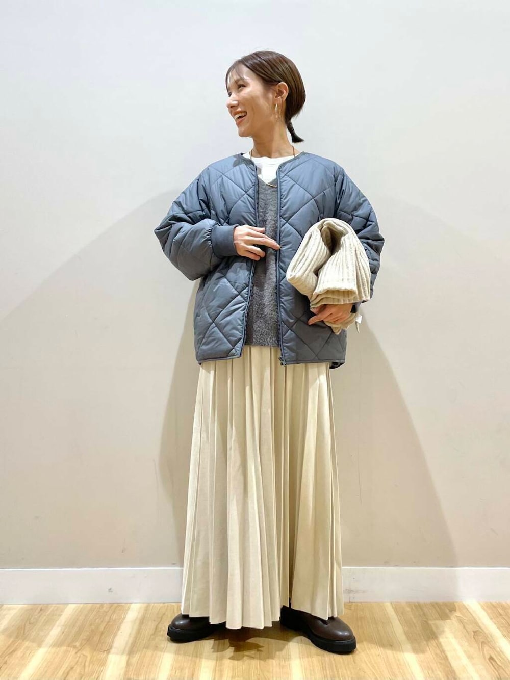 ご覧頂きありがとうございます🥰 シンプルで使いやすい中綿キルトのジャケットは グレーカラーがおしゃれ感💕 ノーカラーなのでタートルネックとも合わせやすいです! 肌触りの良いミニシャギーニット ゆったりしたおつくりでお尻半分隠れる位の 丈感です 女性らしく大人カジュアルな雰囲気です🫶🏻 プリーツスカートはフェイクスエードがシーズンムード❄️ 歩くたび揺れるプリーツがコーデを華やかにしてくれます!