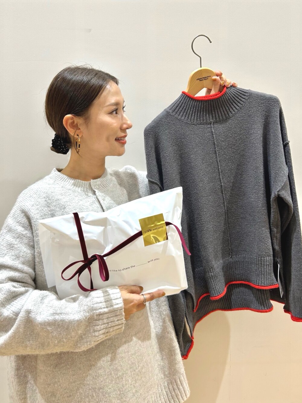 ご覧頂きありがとうございます🥰 大事な方へのプレゼントに、 ITEMS URBAN RESEACHのニットはいかがですか? パイピングの配色がポイントになったこのニットは シンプルながら一枚でコーディネートの主役✨ 幅広い年代の方に喜んで頂ける、 間違いないニットです🫶🏻 今なら赤のベロアリボンで 特別なラッピングをさせて頂いてます🎄 お気軽にお申し付け下さい🥰