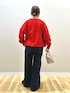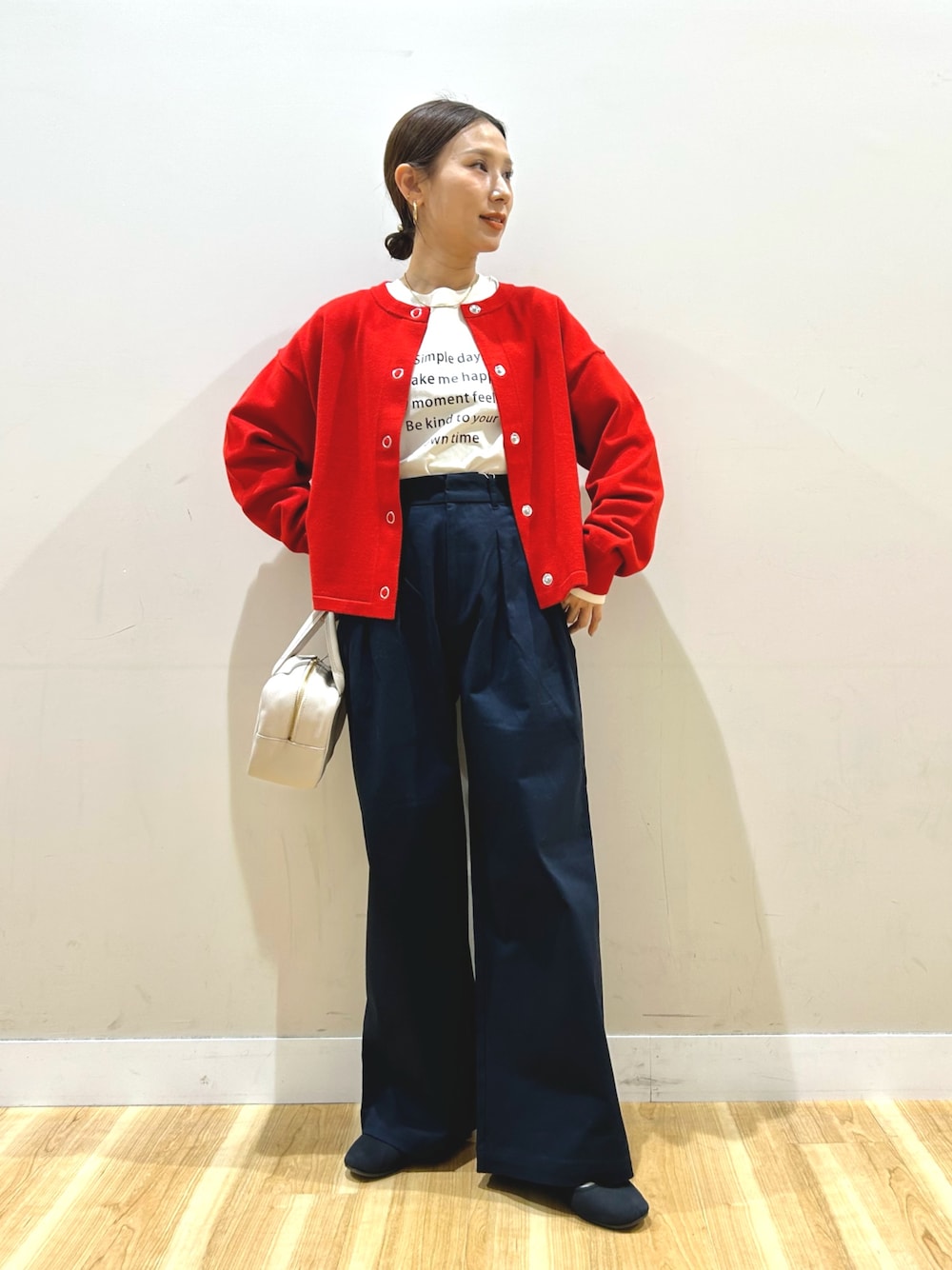 ご覧頂きありがとうございます🥰 DOORSの200日ニットのカーディガン スタッフも絶賛の絶妙シルエットです。 ゆるっと着られつつ着膨れない。 どんなボトムスとも相性良しな丈感 厚みもちょうど良い気持ちの良い生地感です✨ 嫌味のない品の良いレッドは この先もずっと使えるお色だと思います🫶🏻 中に着たロゴロンTは クセのないレタリングがとても使いやすく 一枚あると必ず重宝します! ライトベージュは肌馴染みが良く 白過ぎると浮いて苦手な方におすすめです🥰 前タックで綺麗目なワイドシルエットのチノパン。 一年中履ける程良い厚みの生地感です。 カジュアルにも、綺麗目にも色々な着こなしが叶う 万能アイテムです🫶🏻 157cmの私は普段XSなのでSサイズを履いて ウエスト少し緩めでしたがベルトなく履け、 すこーしだけ長めの理想的な丈感でした!