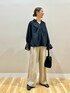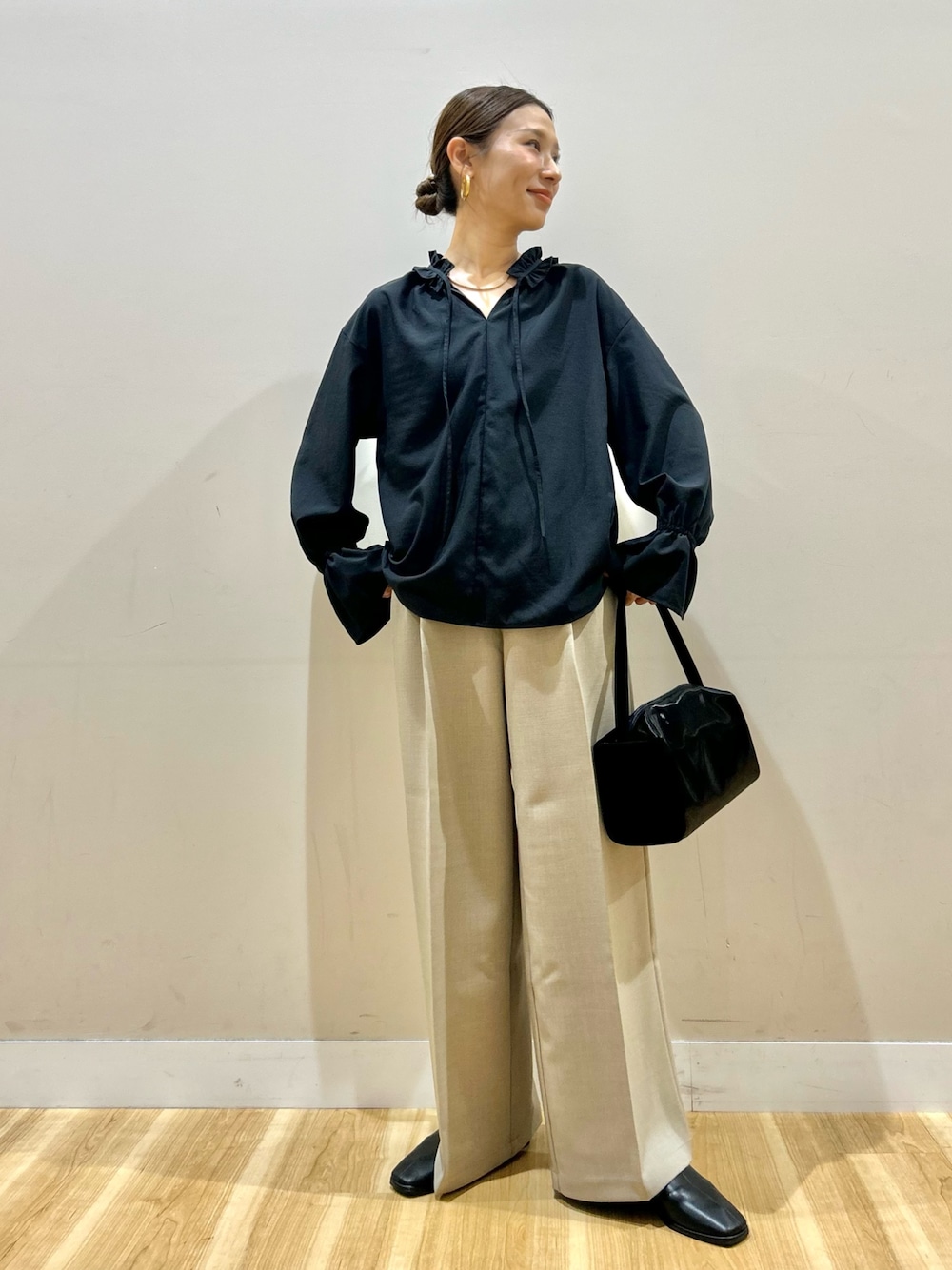 ご覧頂きありがとうございます🥰 襟元のフリルがポイントのブラウスは オフィスやオケージョンにも カジュアルスタイルにも、 柔らかな華やかさを加えてくれます。 リボンは結んでも、襟元を開けて垂らしても。 とても気持ち良く着心地の良い生地感です! チェーンベルトの付いたワイドパンツは 程良い厚みのある生地感が、 肉感を拾わず綺麗なシルエットを出してくれます!