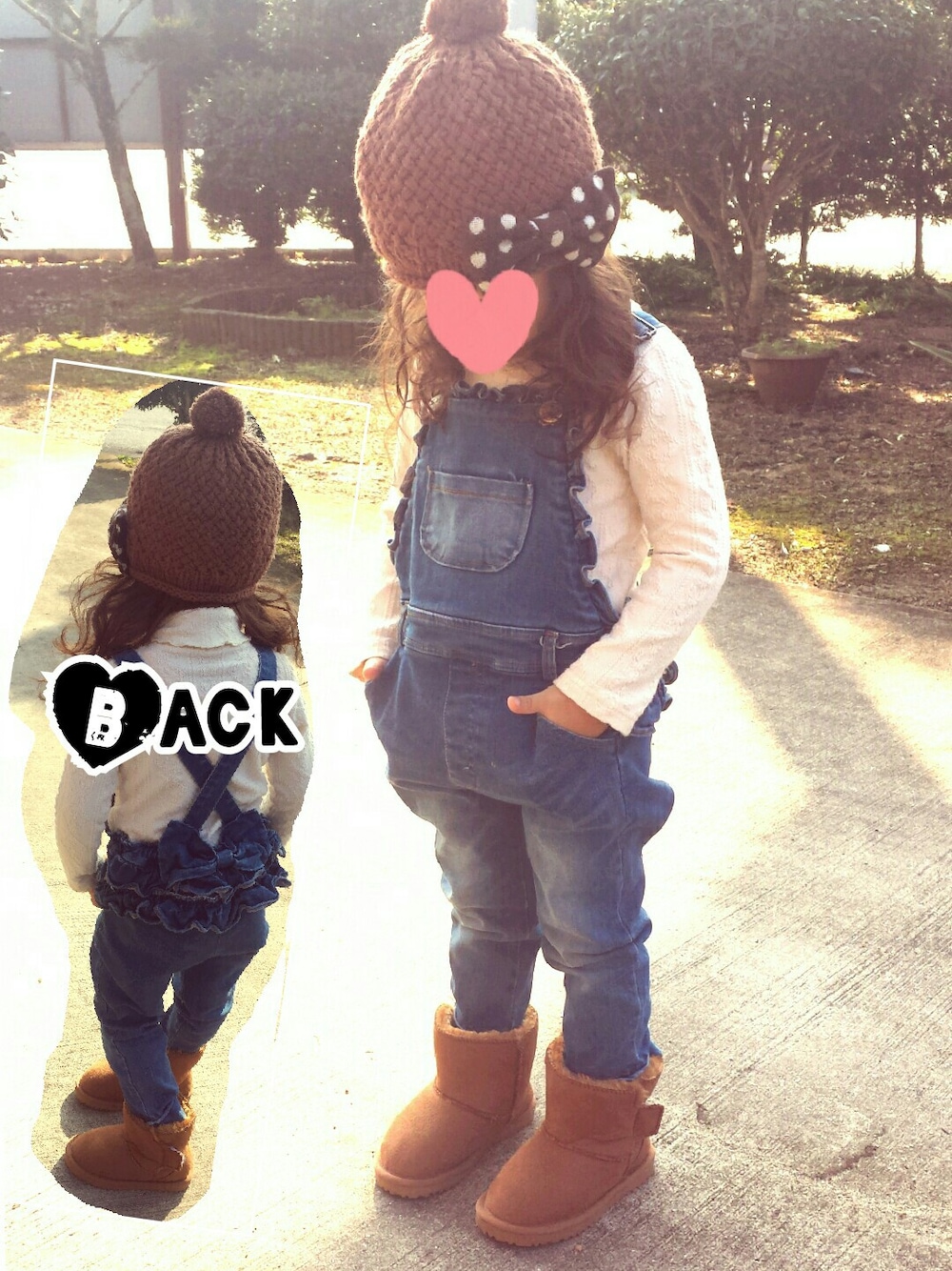 ムートンブーツいつものsizeなのにおおきかった(T_T) どうしましょ…┐(´д`)┌ サロペットのお尻のフリフリりぼんがお気に入り~ 帽子は編み編みのベレー帽だけどニット帽風に♡