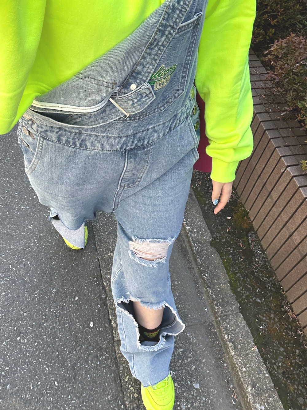 Instagram : @rintan12345 ・ ・ ・ いつもと違う撮り方で珍しくオーバーオール着てみた パーカーと厚底、蛍光イエローでかわいいの‼️