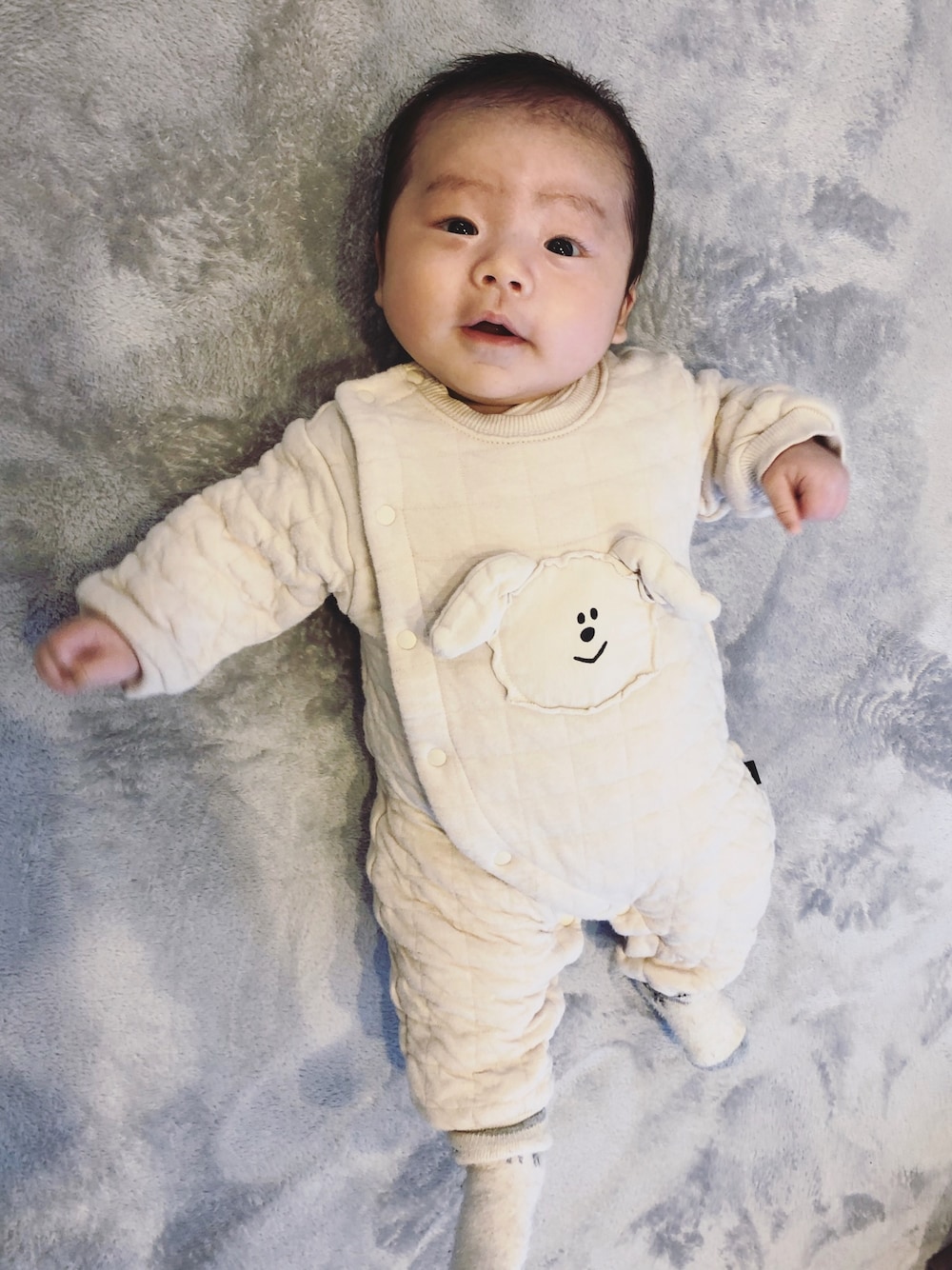 ホワイト系のベビーパジャマ/スリーパーを着用したキッズの冬コーディネートの1枚目の写真
