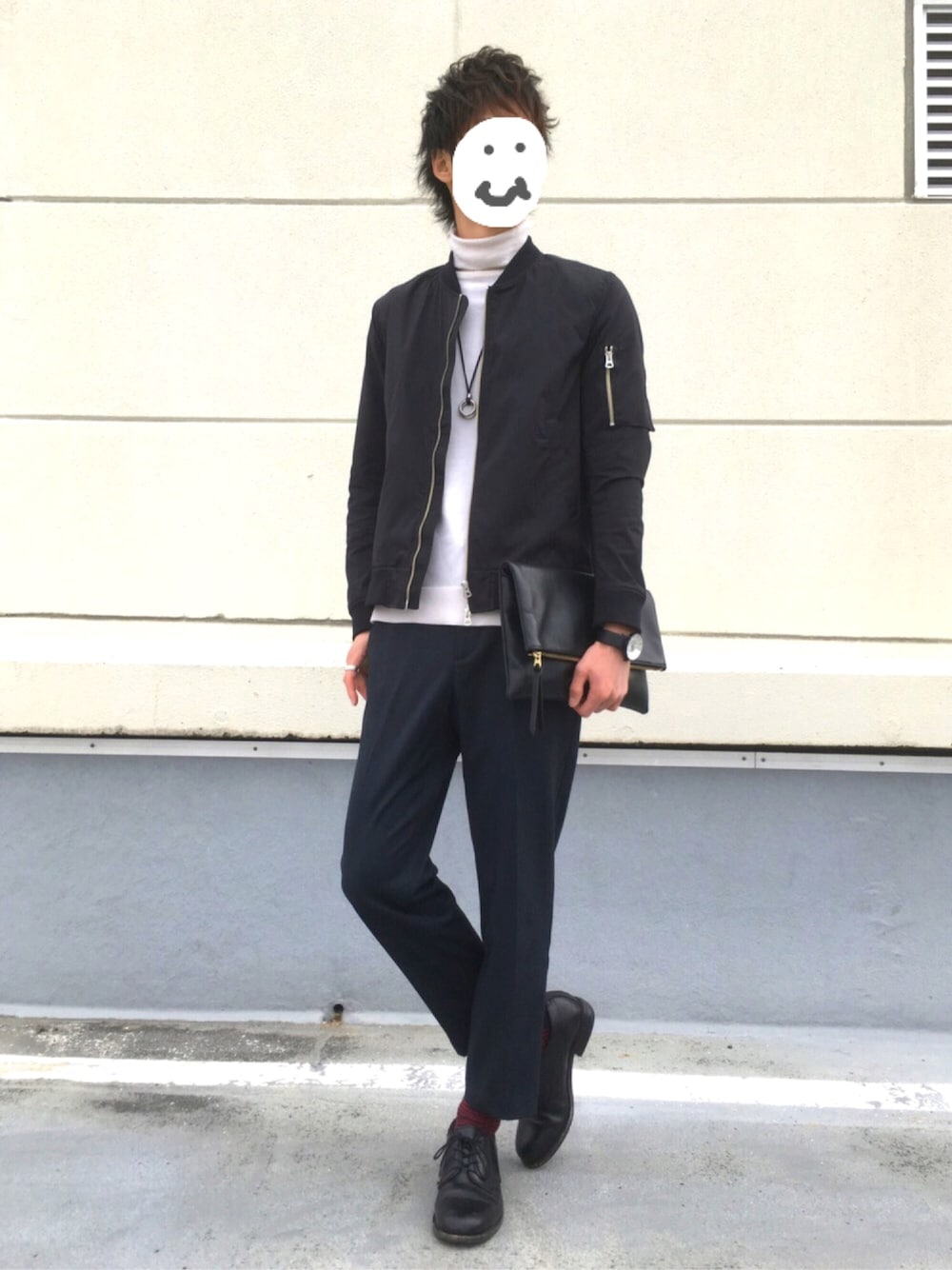 初スラックスコーデ! GUのスラックスが安くて(1990円)履き心地、サイズ感も良くて気に入ってます( ´∀`) 靴下のチラ見せがポイントです!! MA-1 L タートルニット L スラックス S