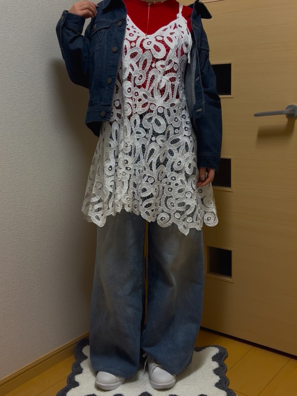 レースのチュニックと赤のtシャツで春感をだし、可愛くなりすぎないようにデニムジャケットとパンツでカジュアルに仕上げました。 レースチュニックはAラインで体のラインが綺麗に見えてアシンメトリーで動きが出て可愛すぎる!