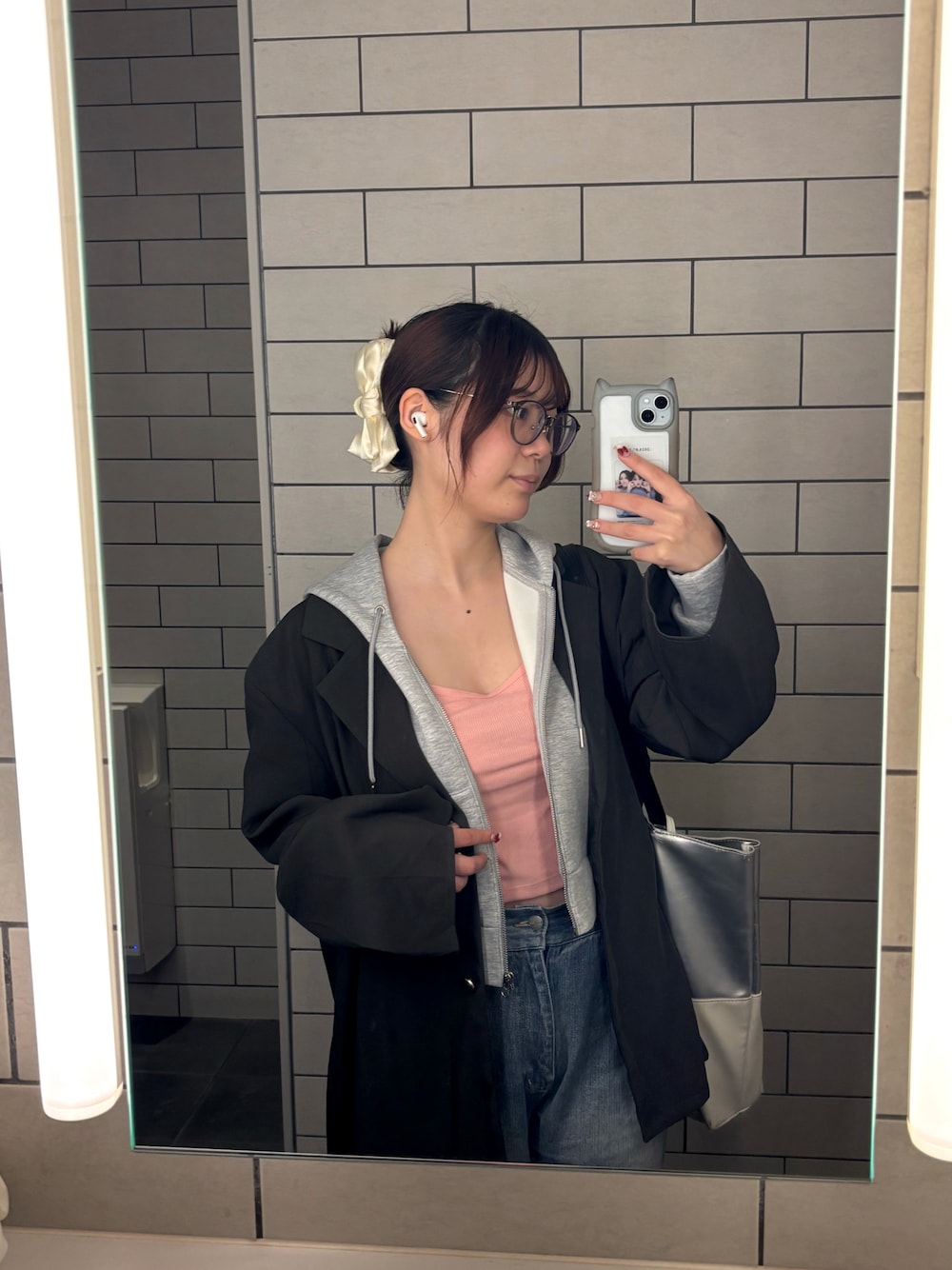 テーラードジャケットにパーカーのレイヤードでカジュアルダウン パーカーをショート丈にすることで寸胴にならず身体のラインにメリハリを Instagram @a_chi.fashion_4257