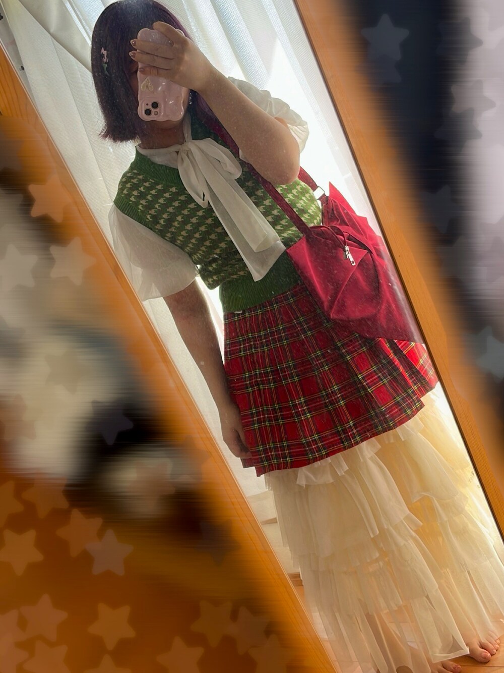 部活の先輩とイタリアン食べに行くので💖フレアスカートが生地・チェックスカートがトマト・ベストがバジル・ブラウスがチーズ🍕追加トマトはバッグと履いてないけど赤い靴下💖ショートヘアにしてから重ね着楽しい