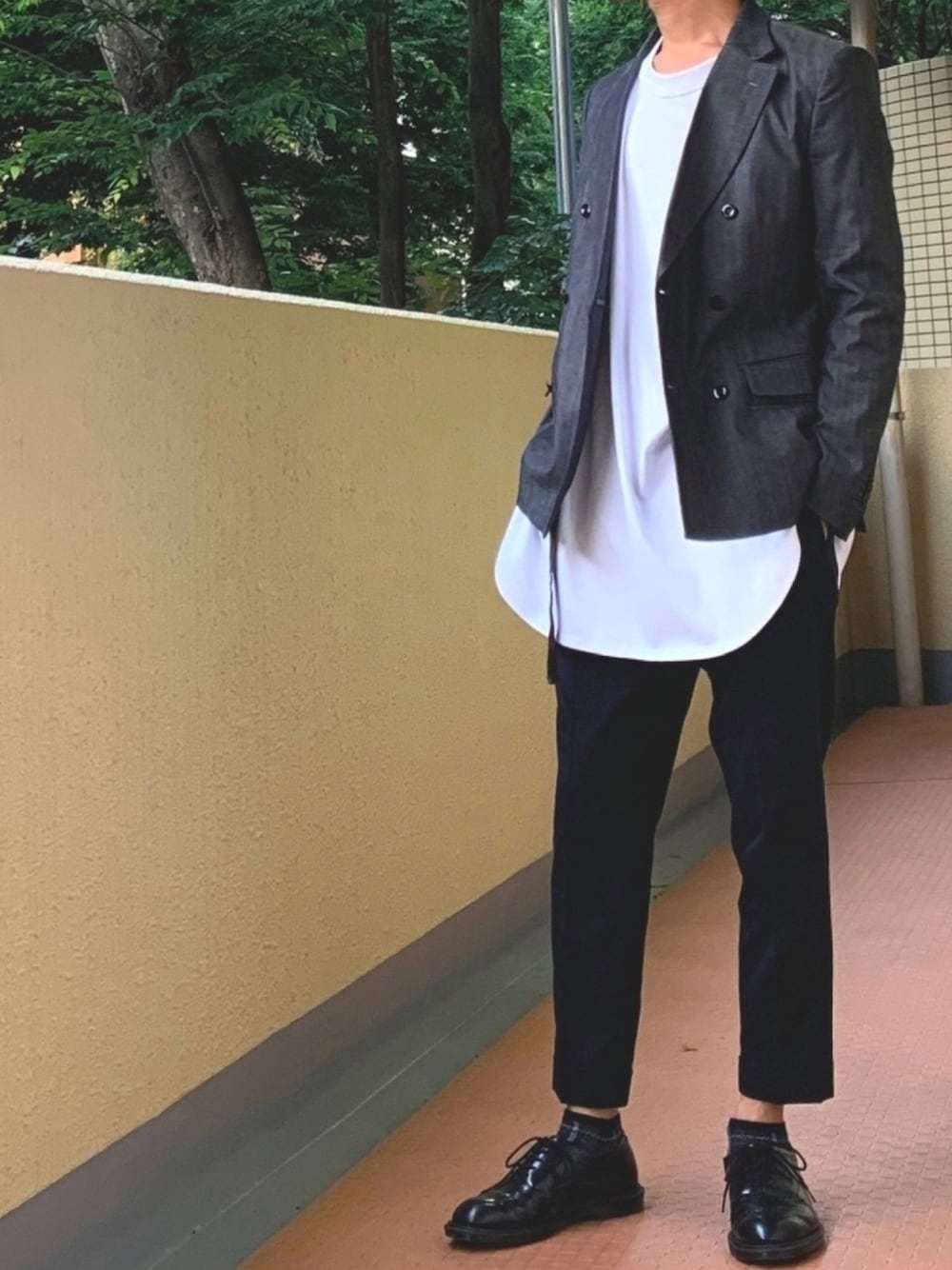 いつもご覧いただきありがとうございます✨✨ いいね、お気に入り励みになります😊 グレー × 白 × 黒のモノトーンコーデです! ビジネスライクなダブルジャケットを、 ビッグサイズのシャツで着くずしてみました😌