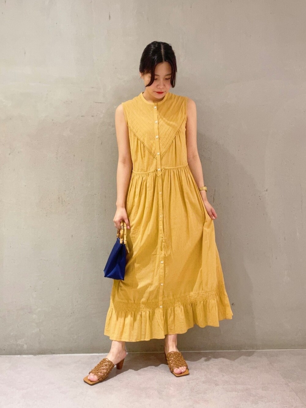 夏らしい鮮やかなカラーのワンピースに、同じく夏らしいメッシュで涼しげなサンダルを合わせて爽やかなコーディネートにしてみました。 落ち着いたブルーのバックで大人見えな印象にしました。